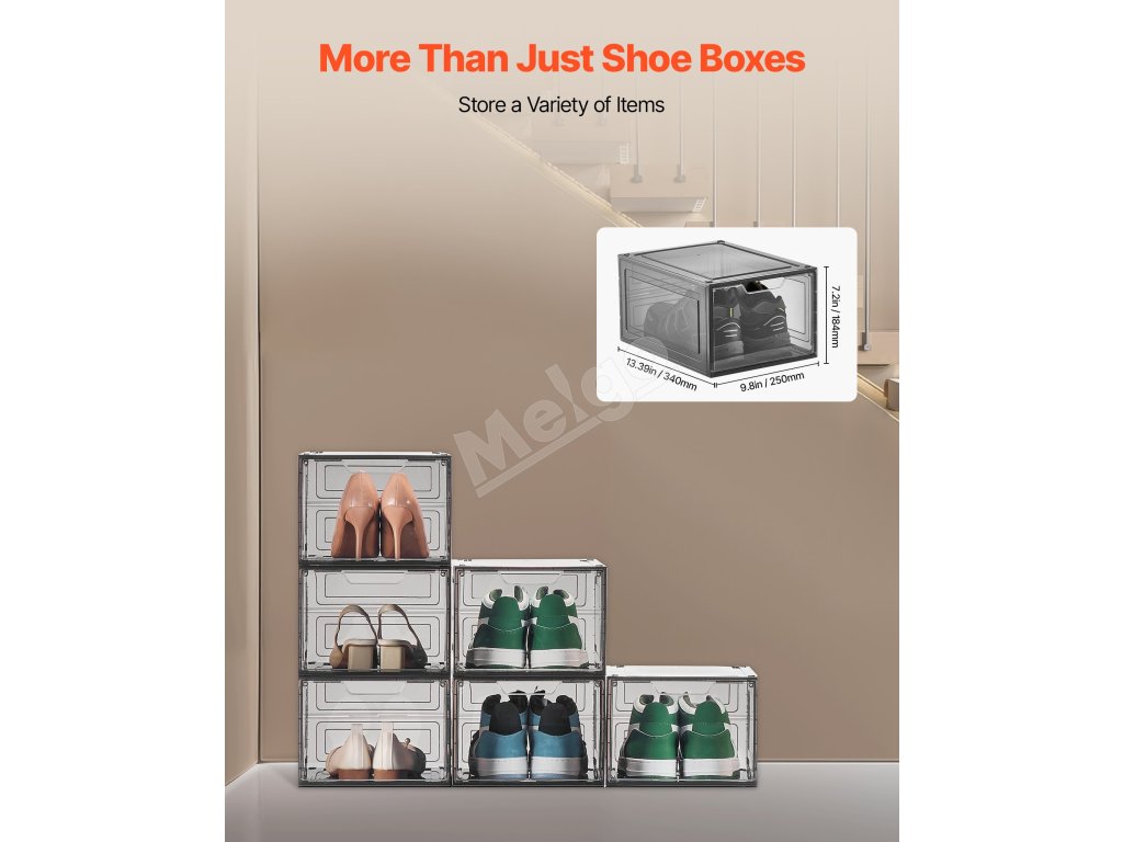 Naše boxy na topánky sa dajú ľahko stohovať na prispôsobené skladovanie. Nie sú určené len na topánky - sú ideálne na ochranu vašich obľúbených predmetov pred poškriabaním a poškodením.
