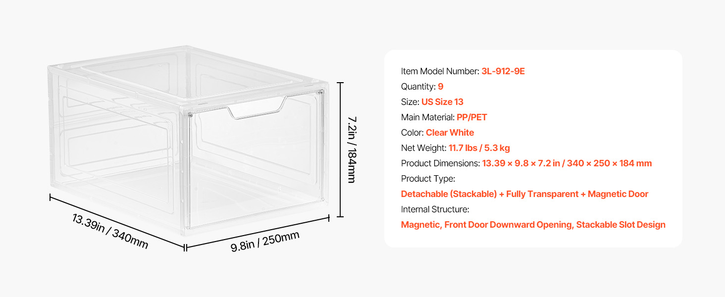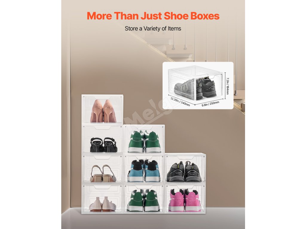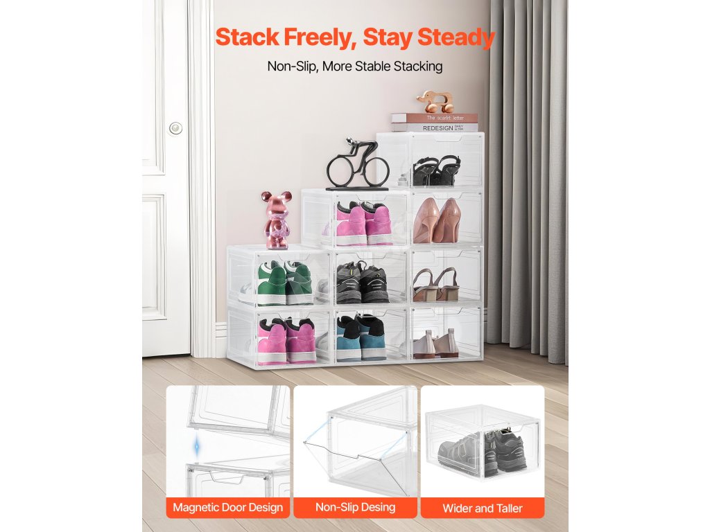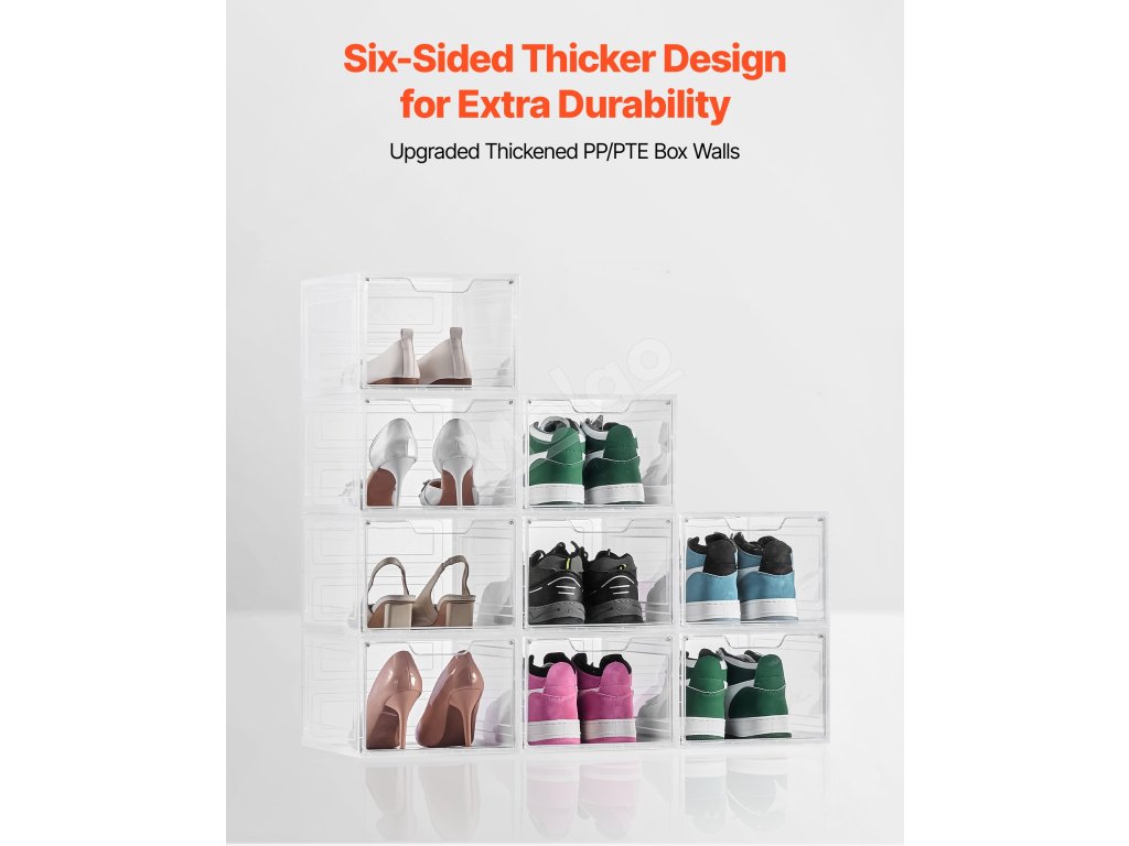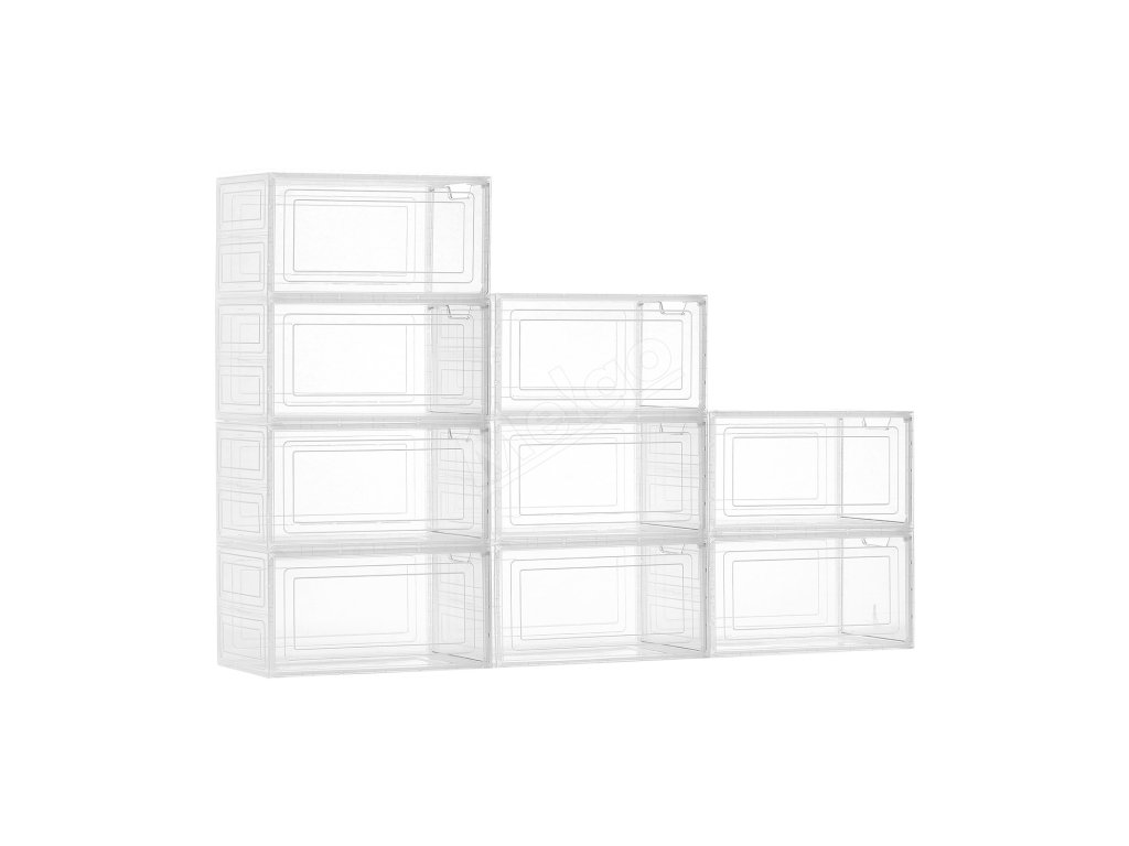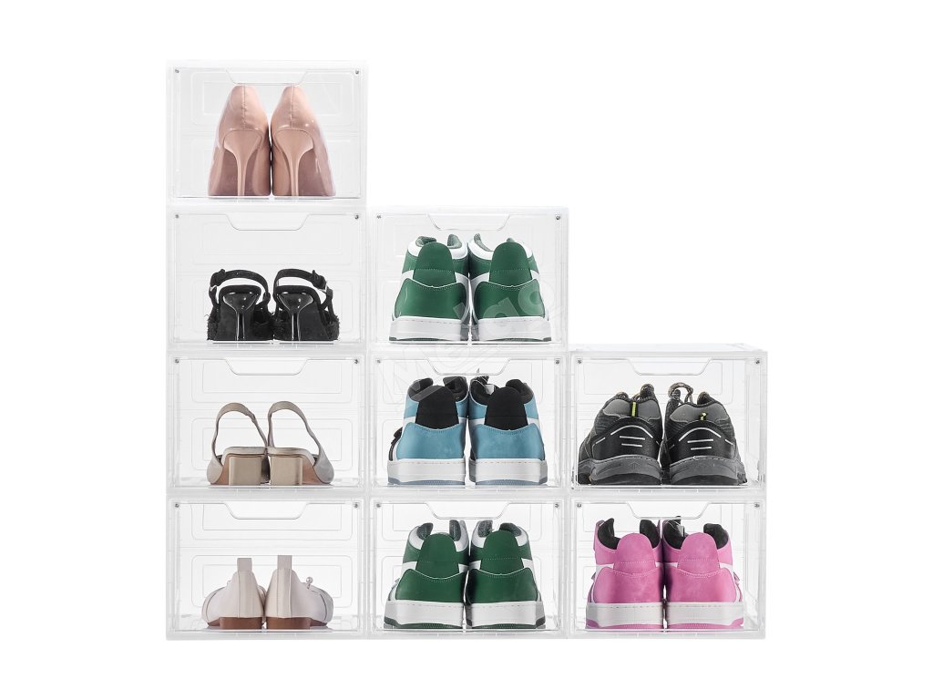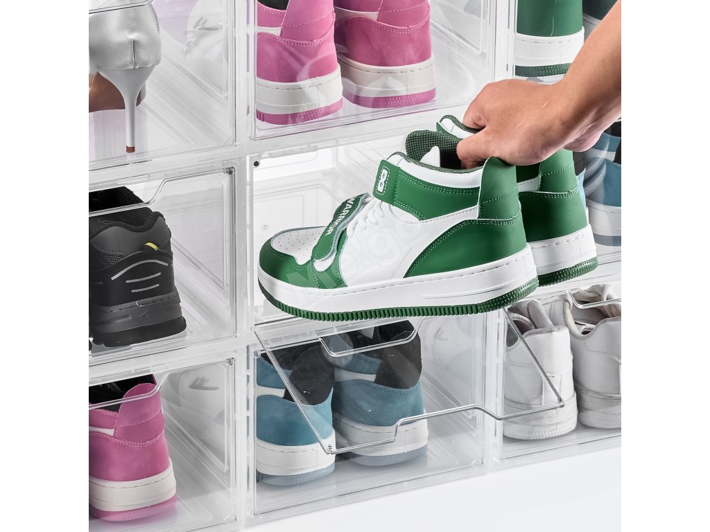 Priehľadné boxy na topánky uskladnia viac topánok a drobných predmetov a zároveň zabezpečia stabilitu vďaka silnej nosnosti a protišmykovej konštrukcii, čím poskytujú bezpečné riešenie na uskladnenie vašej obuvi.