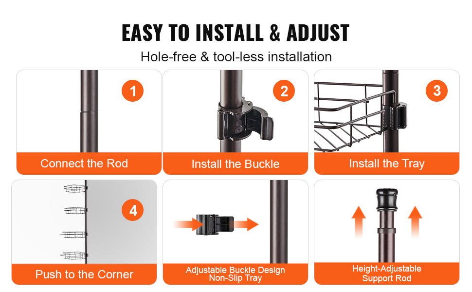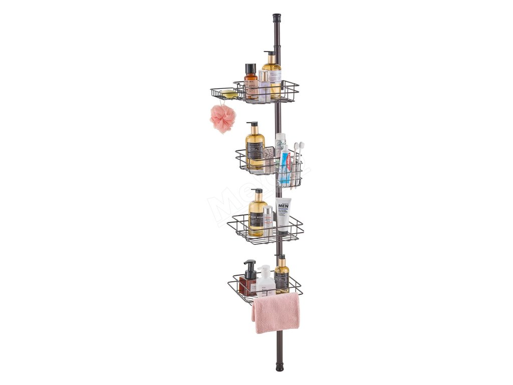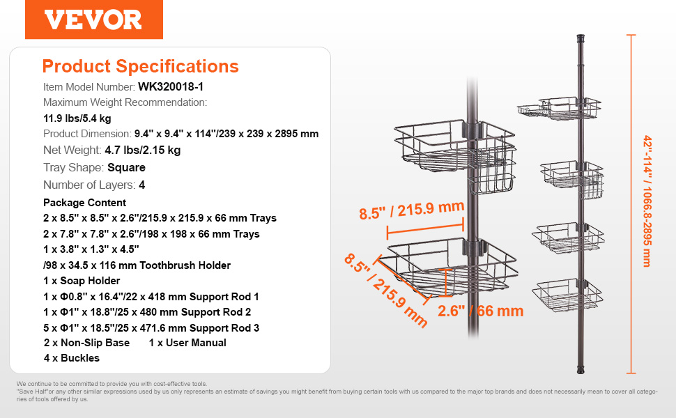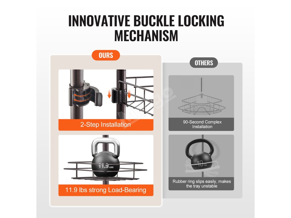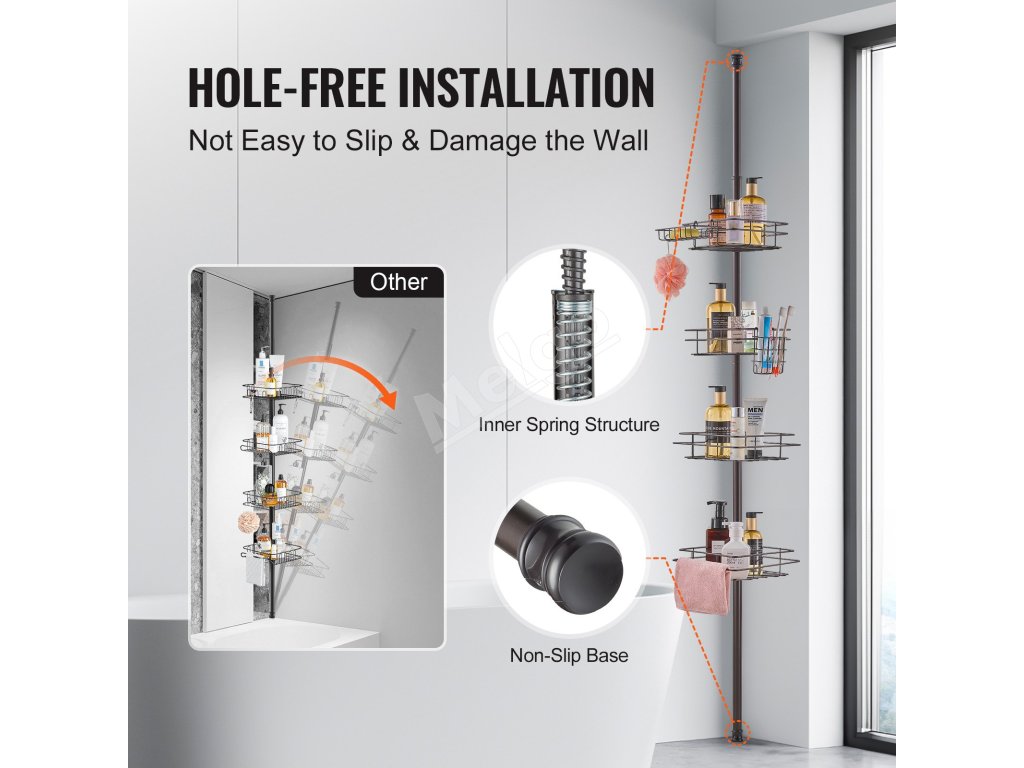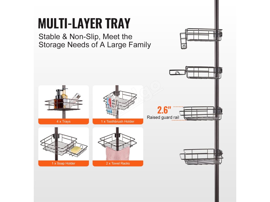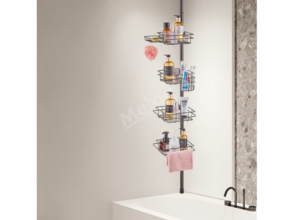 Napínacia tyč sprchového kúta sa dá nastaviť od 42" do 114". Inštaluje sa bez vŕtania. Vyhnite sa inštalácii na stropy alebo šikmé strechy. Je vyrobená z nehrdzavejúcej ocele a je vybavená uzamykacím mechanizmom. Obsahuje štyri priestranné vaničky a jeden držiak na mydlo, jeden držiak na zubné kefky, dva stojany na uteráky.