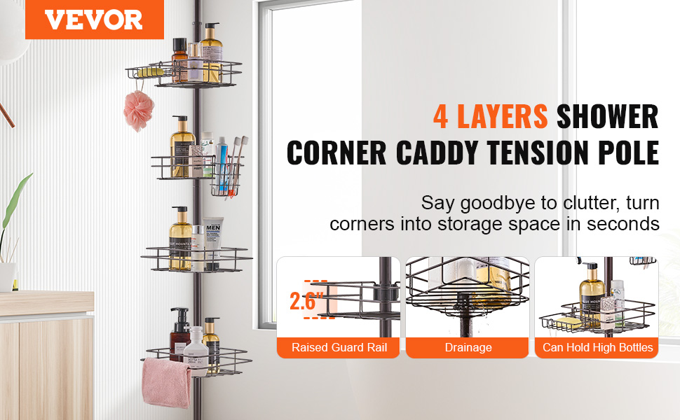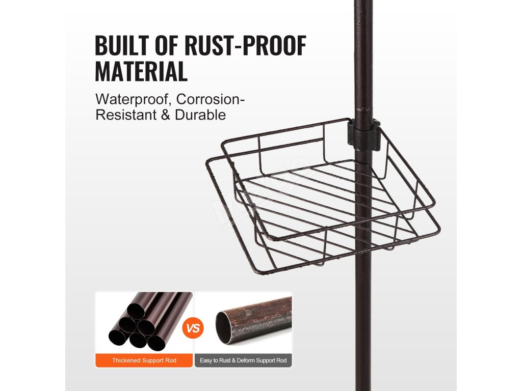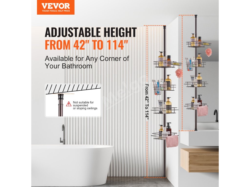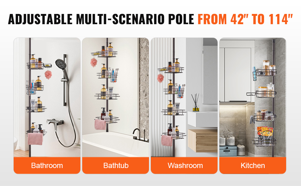 Nastaviteľná napínacia tyč s priemerom 42" až 114" sa dá nastaviť podľa aktuálnej výšky vašej kúpeľne, či už ide o výškový byt alebo nízkopodlažný dom. Samostatný organizér do sprchy pritom môžete umiestniť nielen do kúpeľne, ale aj do vane, RV atď.