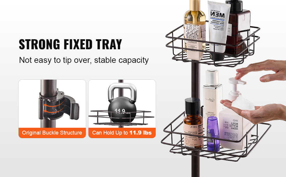 Inovatívny dizajn zosilnených klipov zabezpečuje stabilitu vaničky bez toho, aby sa šmýkala. Jej silná nosnosť 11,9 kg účinne minimalizuje akékoľvek javy posúvania alebo chvenia počas používania sprchovej napínacej tyče, vďaka čomu si používatelia môžu vychutnať bezpečné a stabilné používanie.