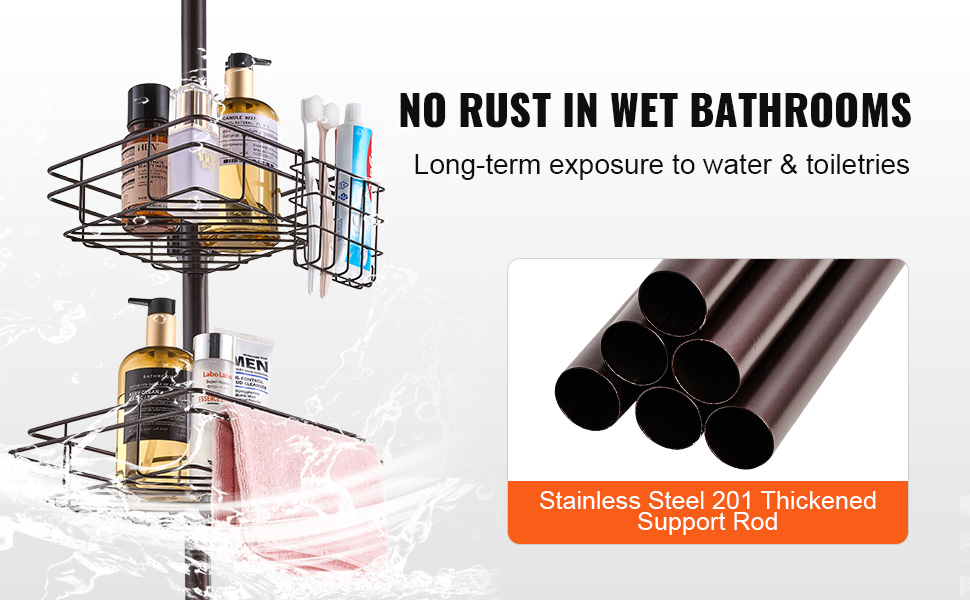 Kúpeľňový organizér napínacej tyče sprchového kúta je vyrobený z vysokokvalitnej nehrdzavejúcej ocele, ktorá je odolná proti korózii a robustná. Aj keď je dlhodobo ponorený vo vode alebo v častom kontakte s toaletnými potrebami, je stále ako nový.