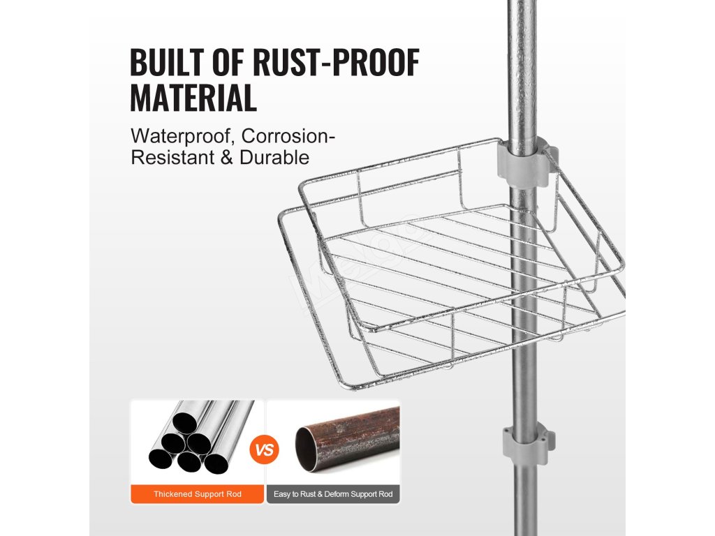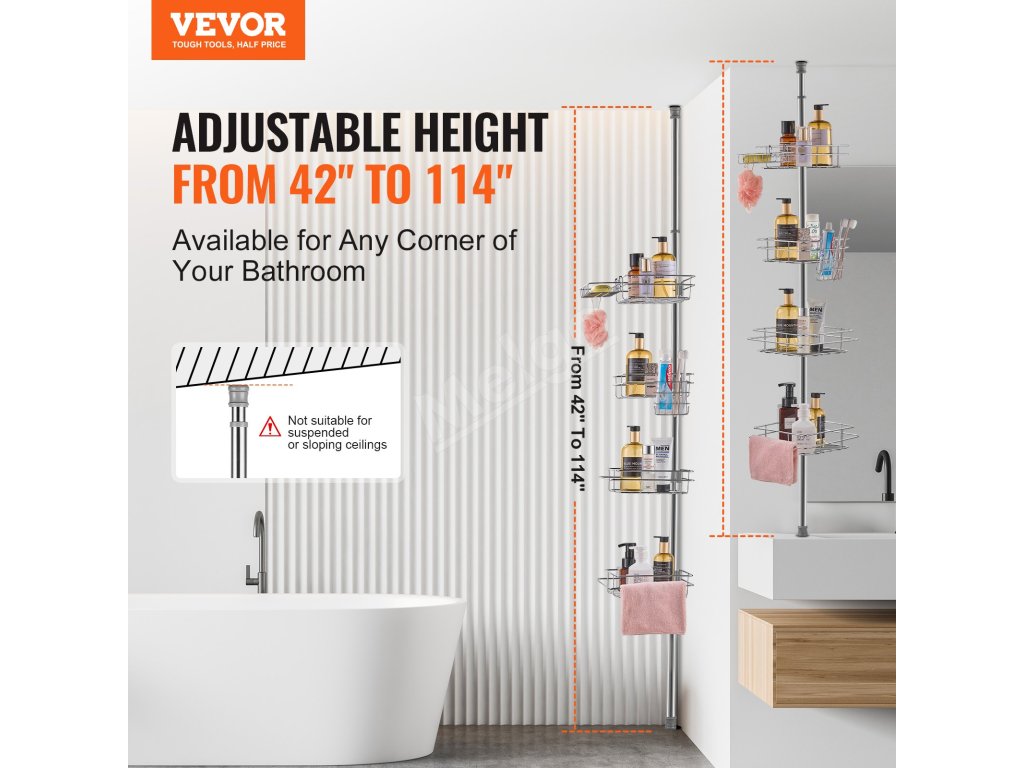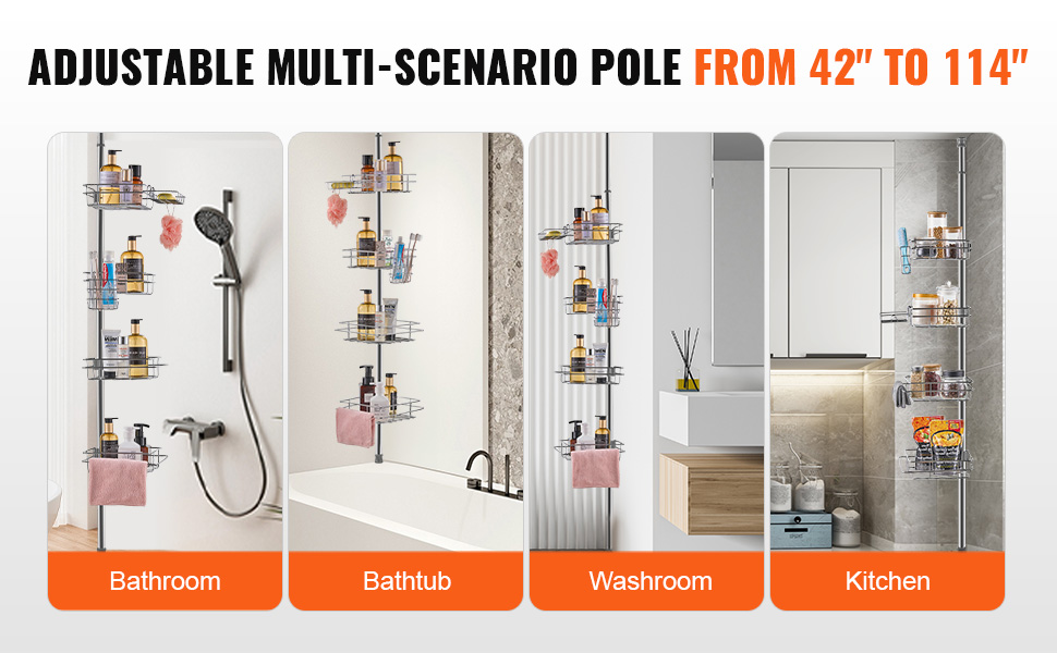 Nastaviteľná napínacia tyč s priemerom 42" až 114" sa dá nastaviť podľa aktuálnej výšky vašej kúpeľne, či už ide o výškový byt alebo nízkopodlažný dom. Samostatný organizér do sprchy pritom môžete umiestniť nielen do kúpeľne, ale aj do vane, RV atď.