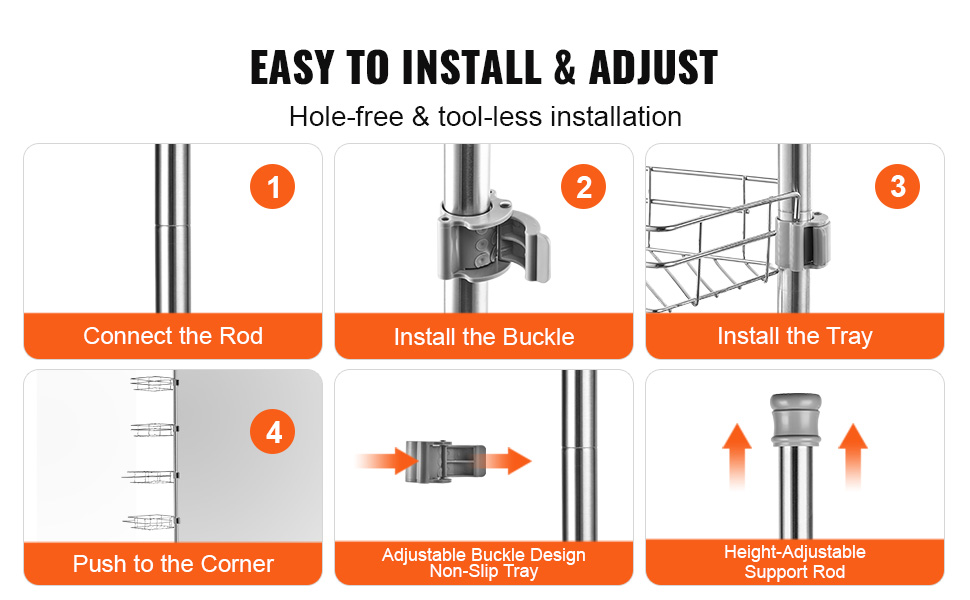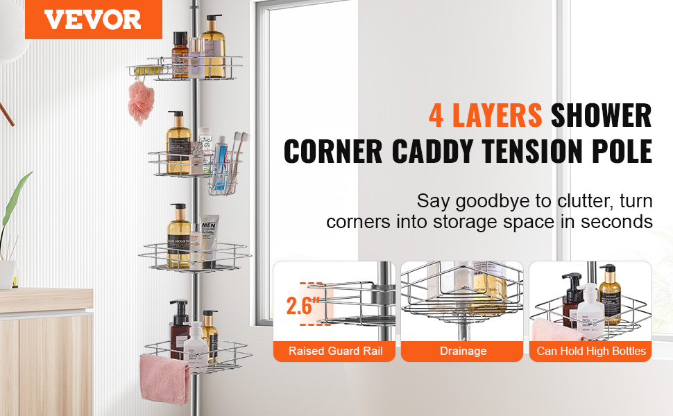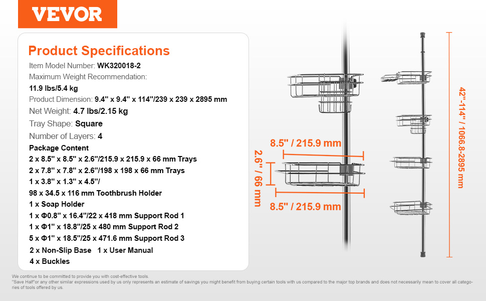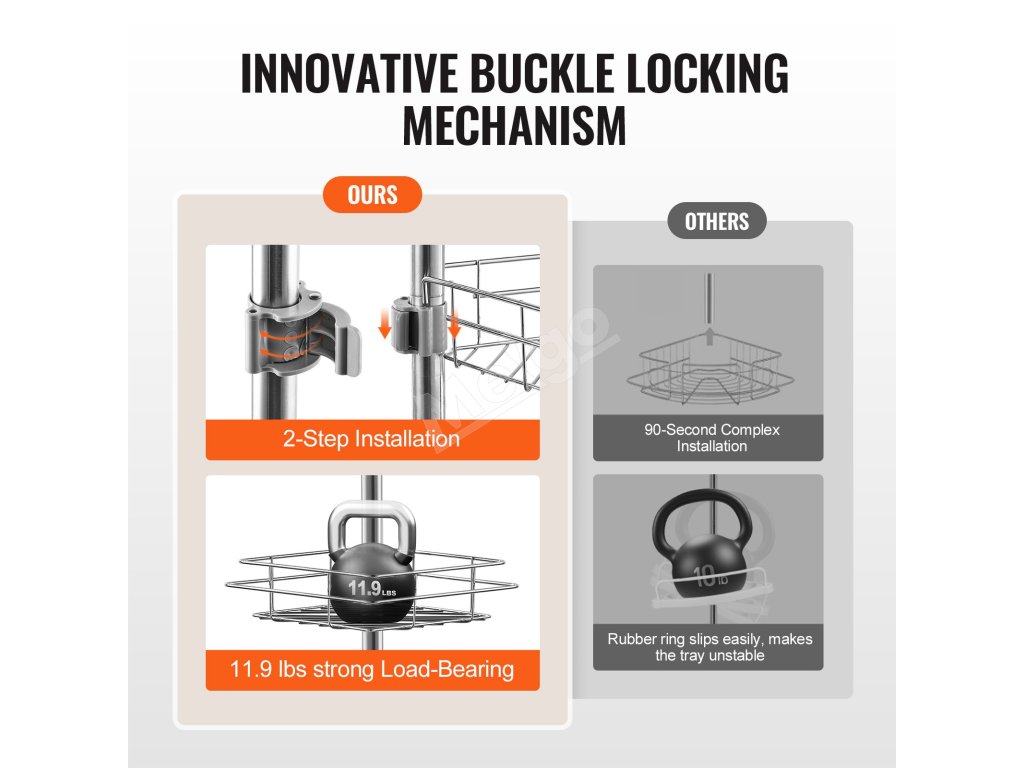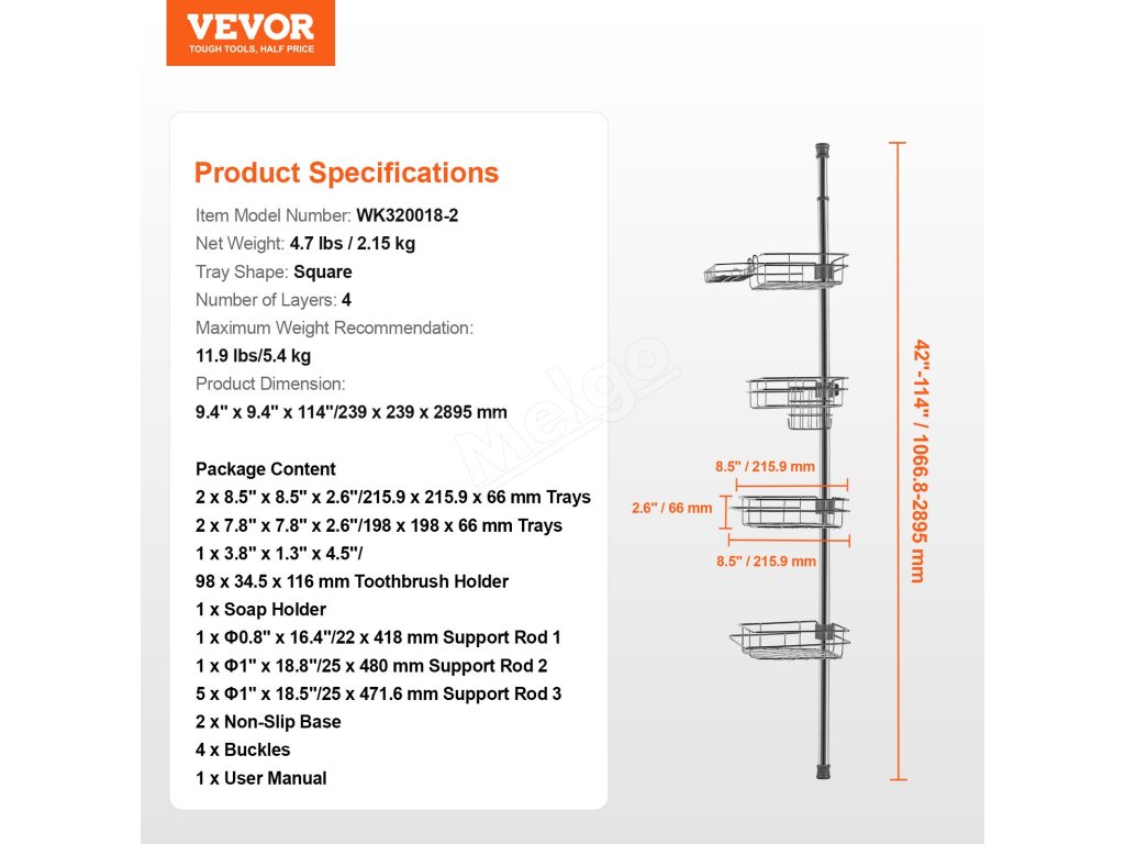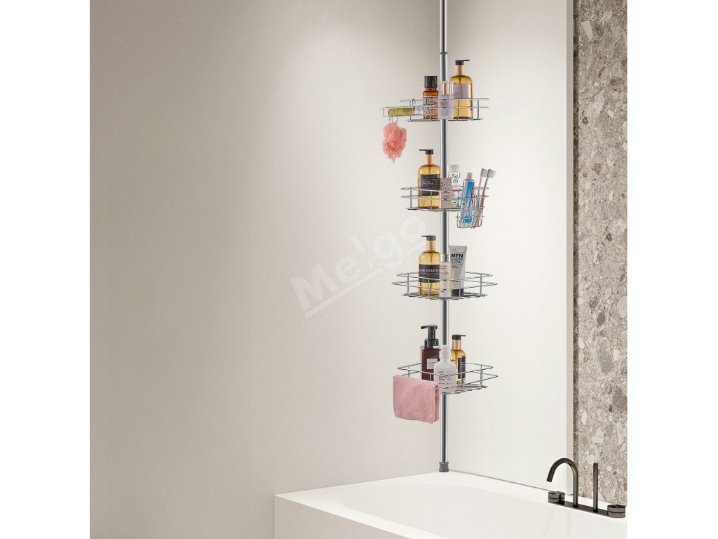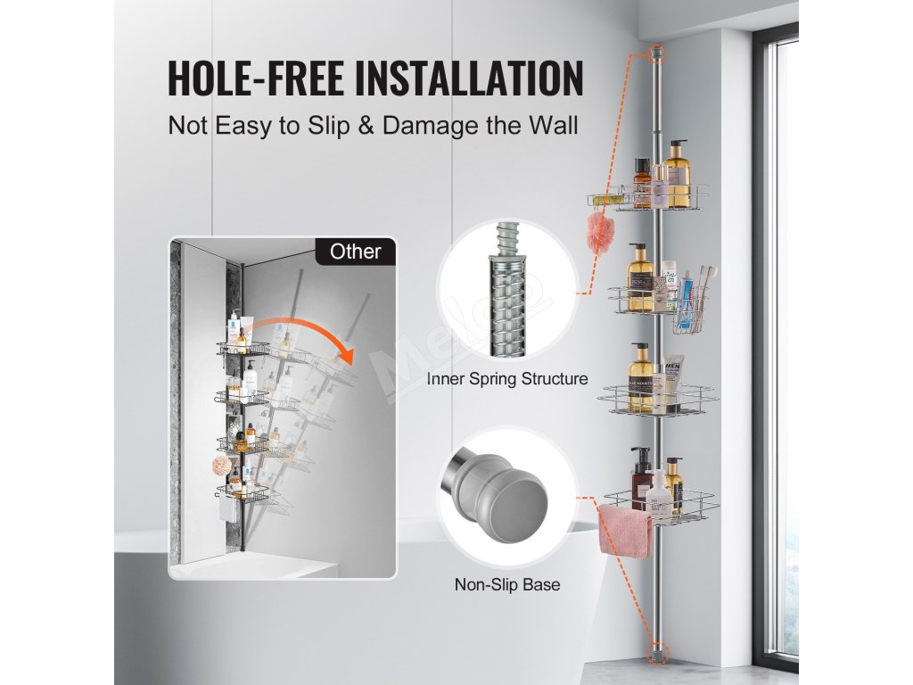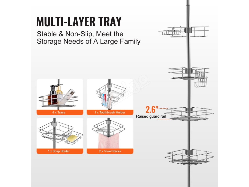 Napínacia tyč sprchového kúta sa dá nastaviť od 42" do 114". Inštaluje sa bez vŕtania. Vyhnite sa inštalácii na stropy alebo šikmé strechy. Je vyrobená z nehrdzavejúcej ocele a je vybavená uzamykacím mechanizmom. Obsahuje štyri priestranné vaničky a jeden držiak na mydlo, jeden držiak na zubné kefky, dva stojany na uteráky.