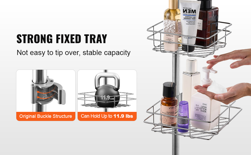 Inovatívny dizajn zosilnených klipov zabezpečuje stabilitu vaničky bez toho, aby sa šmýkala. Jej silná nosnosť 11,9 kg účinne minimalizuje akékoľvek javy posúvania alebo chvenia počas používania sprchovej napínacej tyče, vďaka čomu si používatelia môžu vychutnať bezpečné a stabilné používanie.