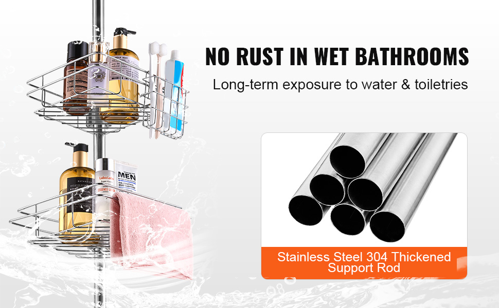 Kúpeľňový organizér napínacej tyče sprchového kúta je vyrobený z vysokokvalitnej nehrdzavejúcej ocele, ktorá je odolná proti korózii a robustná. Aj keď je dlhodobo ponorený vo vode alebo v častom kontakte s toaletnými potrebami, je stále ako nový.