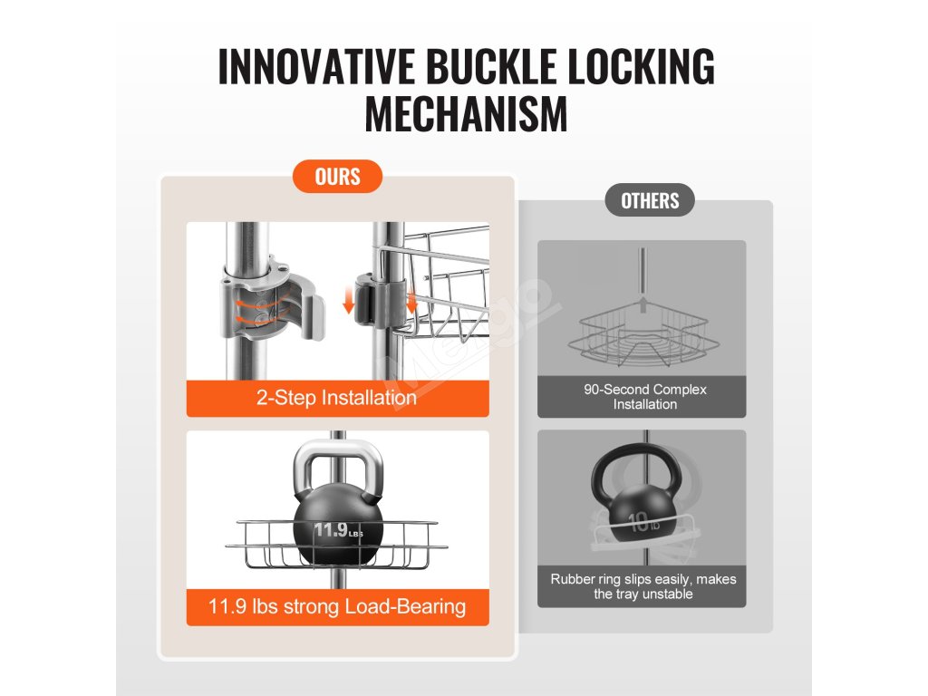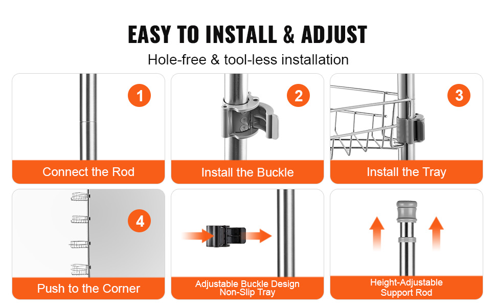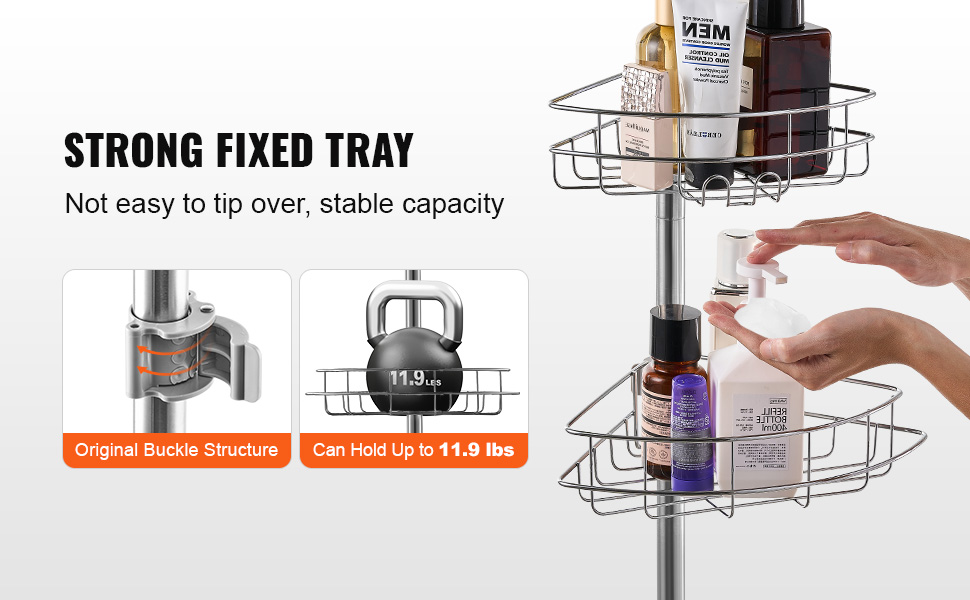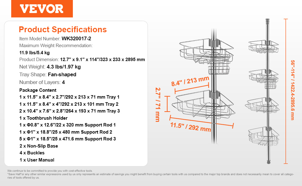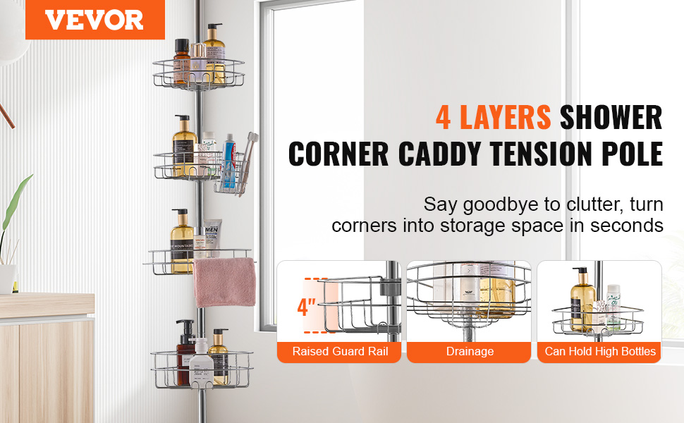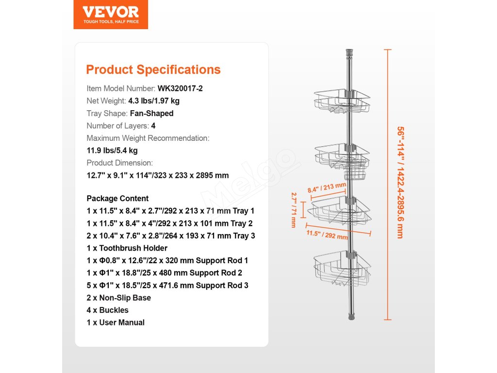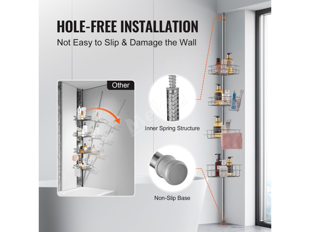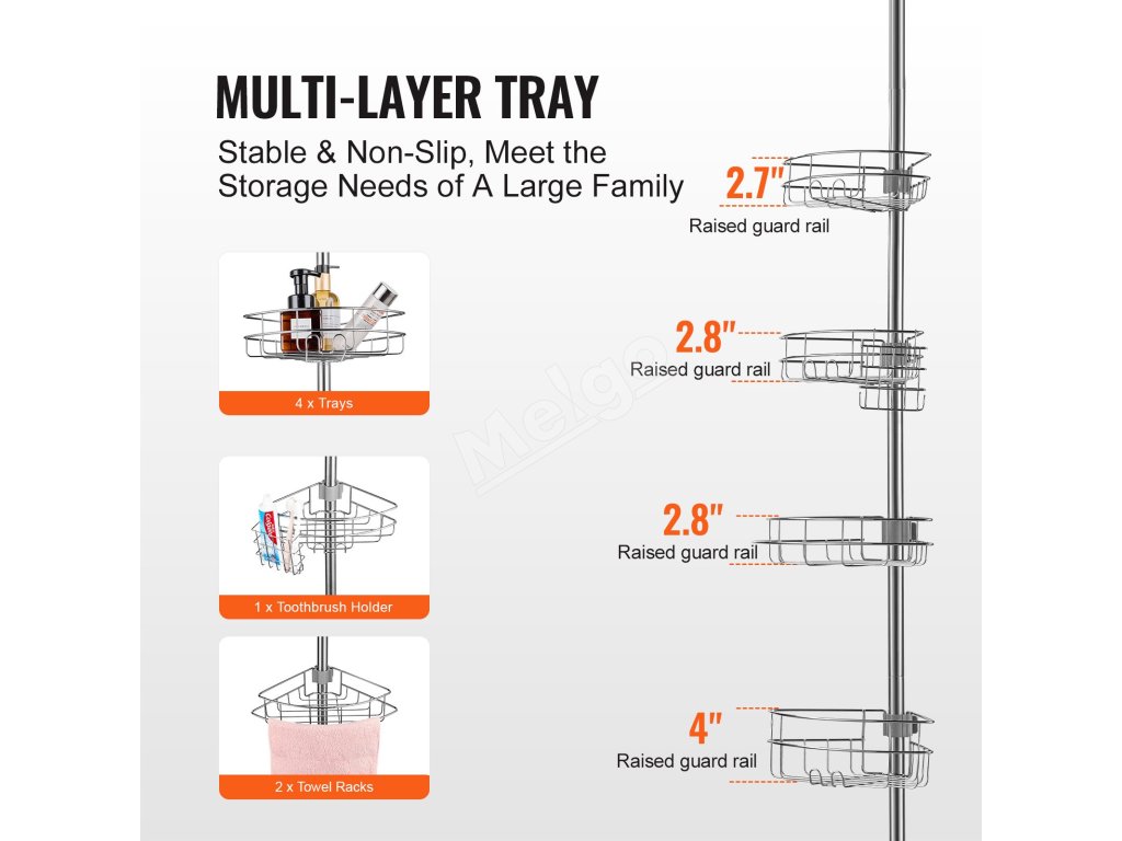 Napínacia tyč sprchového kúta sa dá nastaviť od 56" do 114". Inštaluje sa bez vŕtania. Vyhnite sa inštalácii na stropy alebo šikmé strechy. Je vyrobená z nehrdzavejúcej ocele a je vybavená uzamykacím mechanizmom. Obsahuje štyri priestranné vaničky a jeden držiak na zubné kefky, jeden držiak na uteráky.