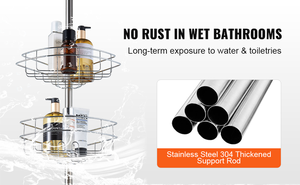 Kúpeľňový organizér napínacej tyče sprchového kúta je vyrobený z vysokokvalitnej nehrdzavejúcej ocele, ktorá je odolná proti korózii a robustná. Aj keď je dlhodobo ponorený vo vode alebo v častom kontakte s toaletnými potrebami, je stále ako nový.