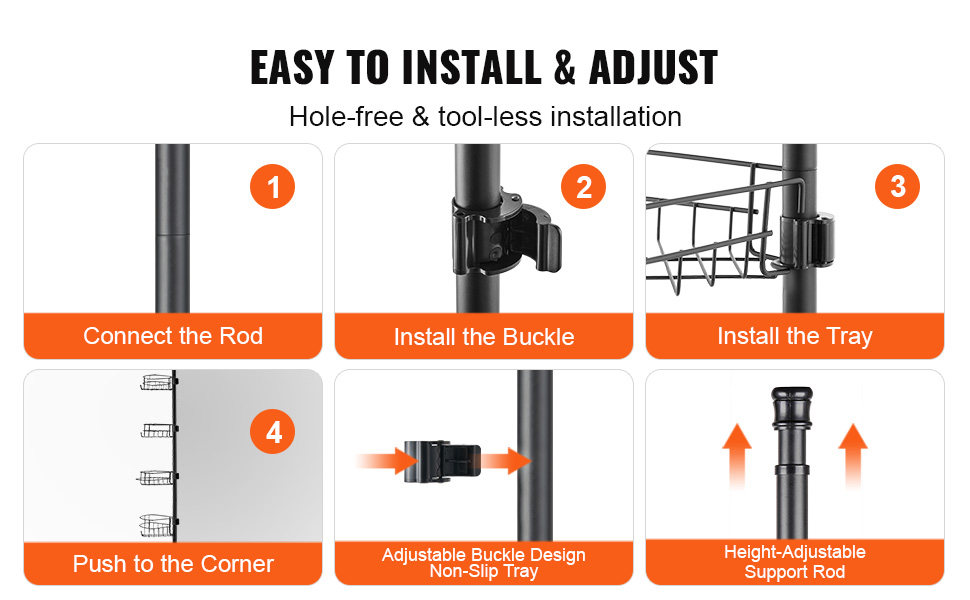 Napínacia tyč sprchového kúta sa dá nastaviť od 56" do 114". Inštaluje sa bez vŕtania. Vyhnite sa inštalácii na stropy alebo šikmé strechy. Je vyrobená z nehrdzavejúcej ocele a je vybavená uzamykacím mechanizmom. Obsahuje štyri priestranné vaničky a jeden držiak na zubné kefky, jeden držiak na uteráky.