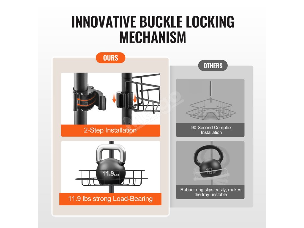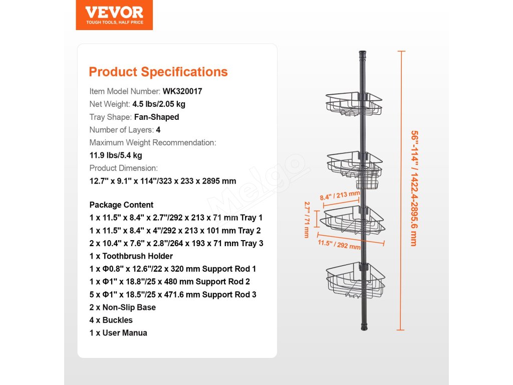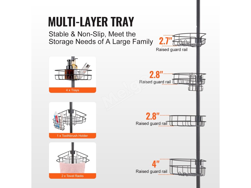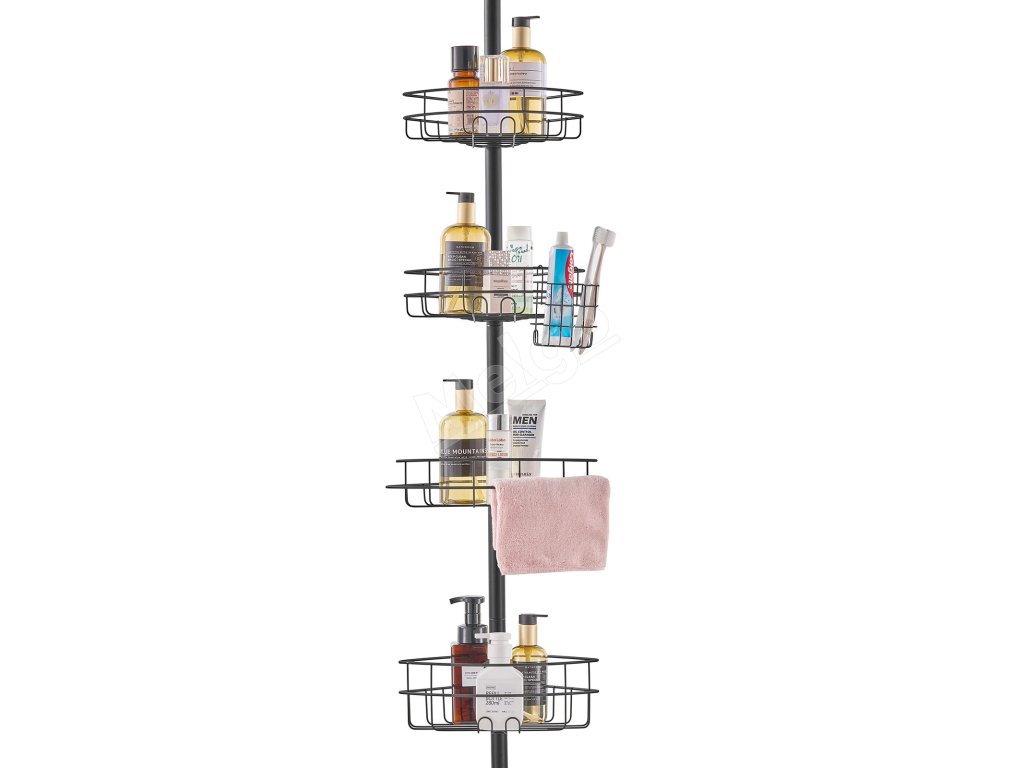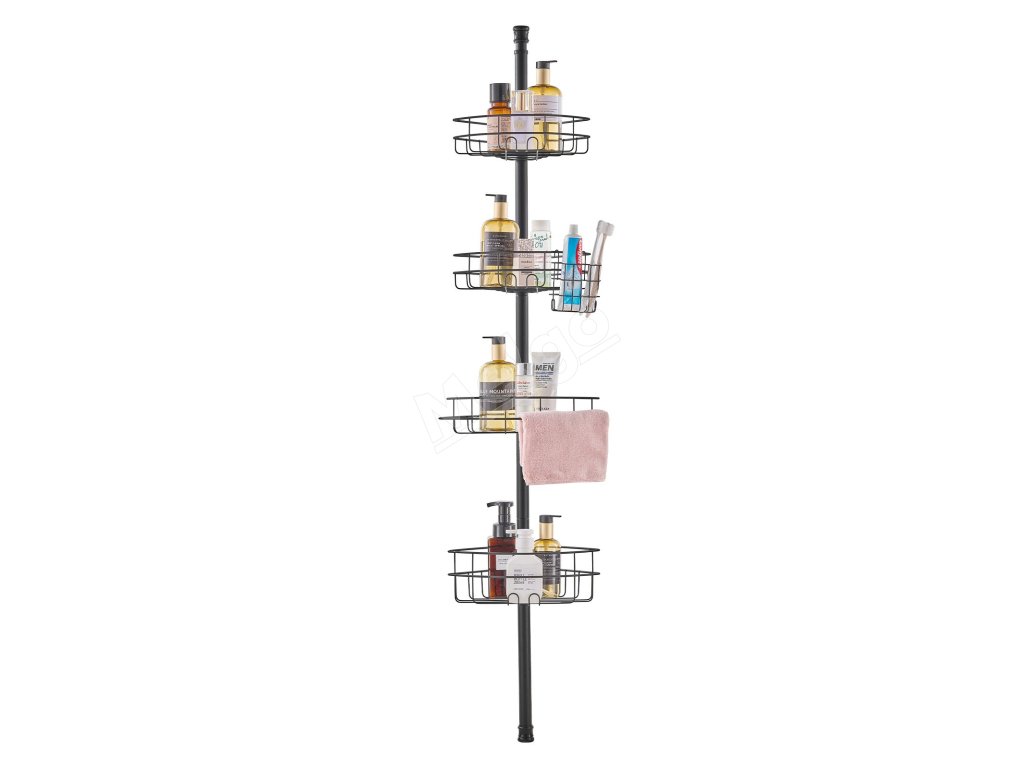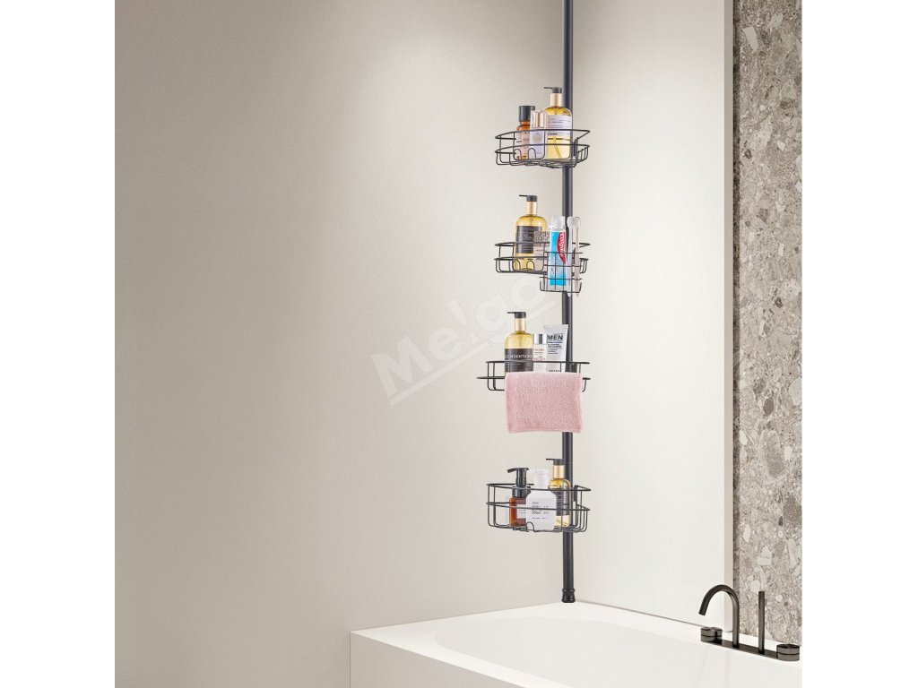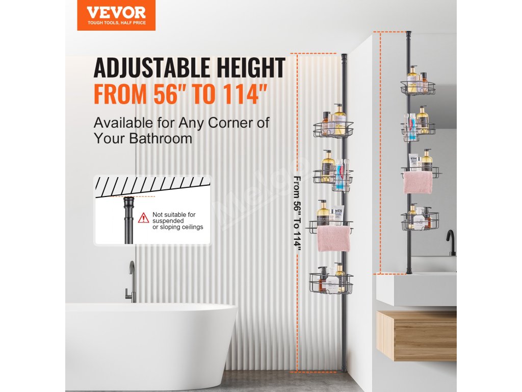 Napínacia tyč sprchového kúta sa dá nastaviť od 56" do 114". Inštaluje sa bez vŕtania. Vyhnite sa inštalácii na stropy alebo šikmé strechy. Je vyrobená z nehrdzavejúcej ocele a je vybavená uzamykacím mechanizmom. Obsahuje štyri priestranné vaničky a jeden držiak na zubné kefky, jeden držiak na uteráky.