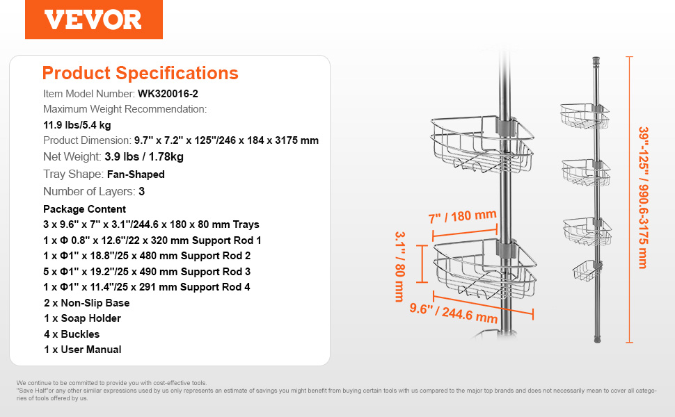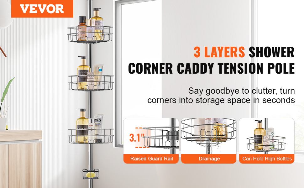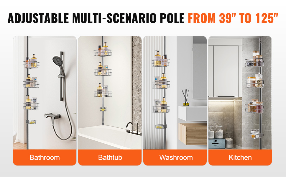 Nastaviteľná napínacia tyč s uhlopriečkou 39" až 125" sa dá prispôsobiť podľa aktuálnej výšky vašej kúpeľne, či už ide o výškový byt alebo nízkopodlažný dom. Pritom samostatný organizér do sprchy možno umiestniť nielen do kúpeľne, ale aj do vane, RV atď.