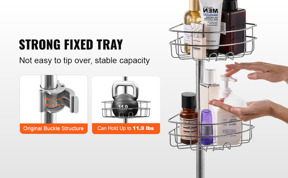Inovatívny dizajn zosilnených klipov zabezpečuje stabilitu vaničky bez toho, aby sa šmýkala. Jej silná nosnosť 11,9 kg účinne minimalizuje akékoľvek javy posúvania alebo chvenia počas používania sprchovej napínacej tyče, vďaka čomu si používatelia môžu vychutnať bezpečné a stabilné používanie.