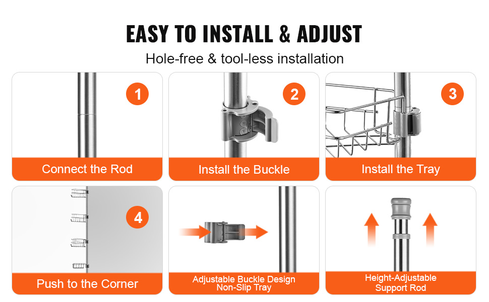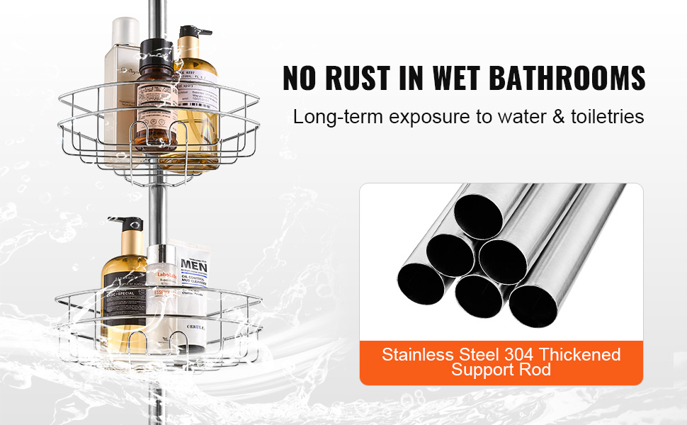 Kúpeľňový organizér napínacej tyče sprchového kúta je vyrobený z vysokokvalitnej nehrdzavejúcej ocele, ktorá je odolná proti korózii a robustná. Aj keď je dlhodobo ponorený vo vode alebo v častom kontakte s toaletnými potrebami, je stále ako nový.