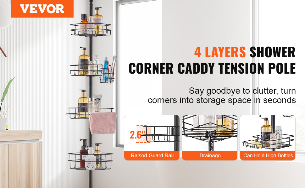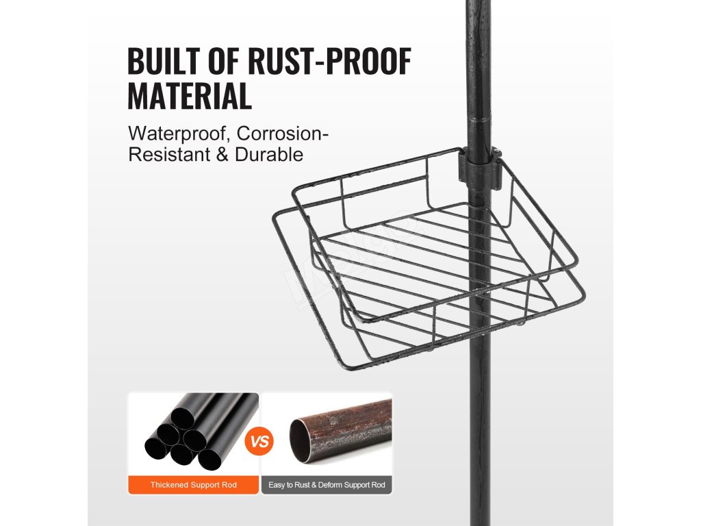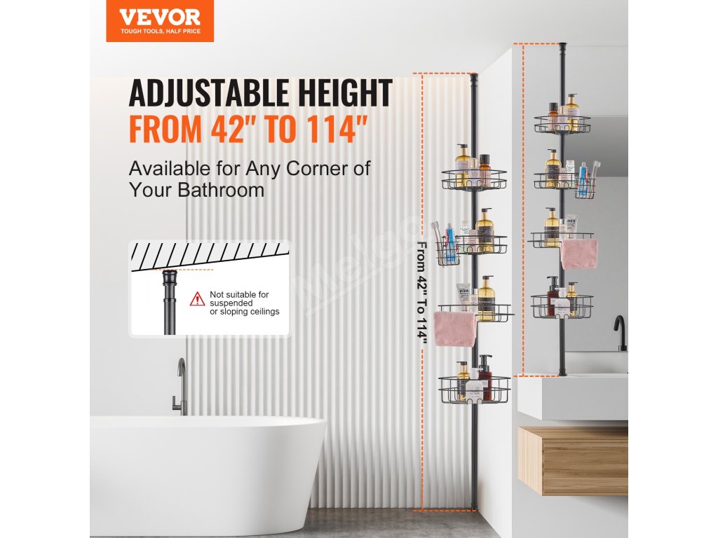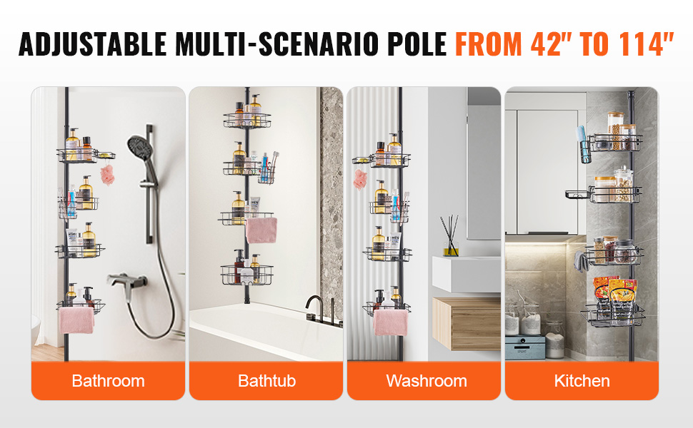 Nastaviteľná napínacia tyč s priemerom 42" až 114" sa dá nastaviť podľa aktuálnej výšky vašej kúpeľne, či už ide o výškový byt alebo nízkopodlažný dom. Samostatný organizér do sprchy pritom môžete umiestniť nielen do kúpeľne, ale aj do vane, RV atď.