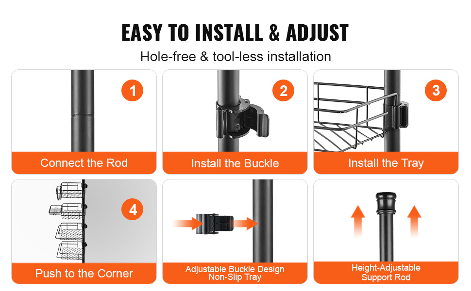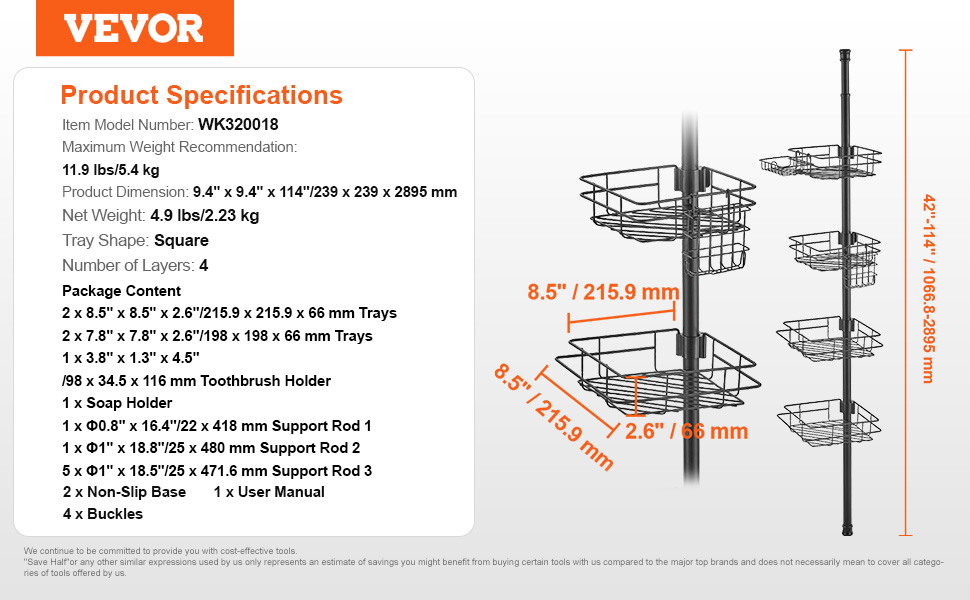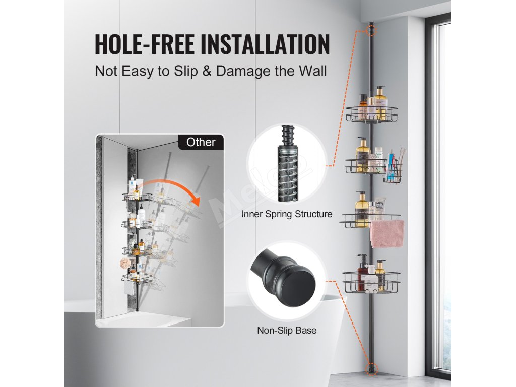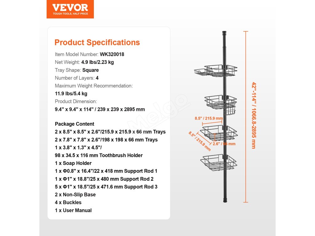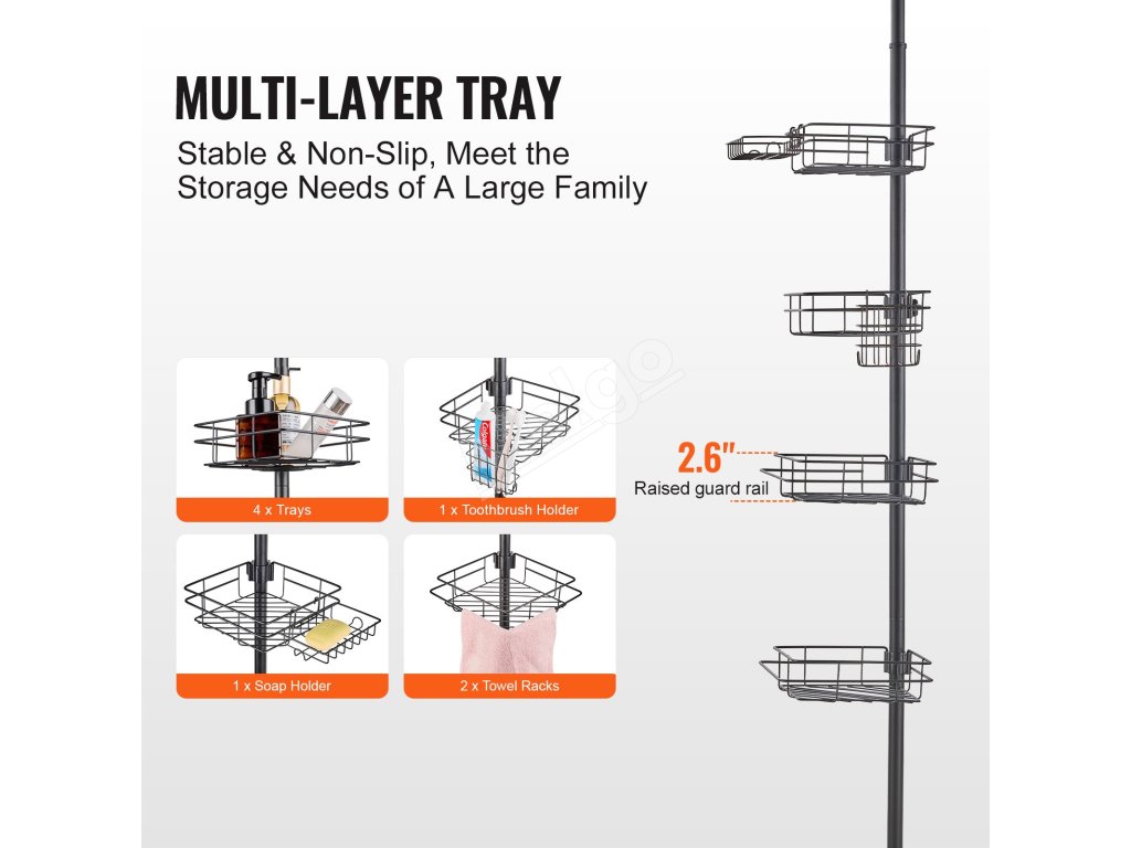 Napínacia tyč sprchového kúta sa dá nastaviť od 42" do 114". Inštaluje sa bez vŕtania. Vyhnite sa inštalácii na stropy alebo šikmé strechy. Je vyrobená z nehrdzavejúcej ocele a je vybavená uzamykacím mechanizmom. Obsahuje štyri priestranné vaničky a jeden držiak na mydlo, jeden držiak na zubné kefky, dva stojany na uteráky.