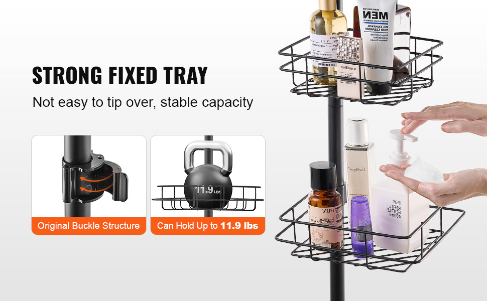 Inovatívny dizajn zosilnených klipov zabezpečuje stabilitu vaničky bez toho, aby sa šmýkala. Jej silná nosnosť 11,9 kg účinne minimalizuje akékoľvek javy posúvania alebo chvenia počas používania sprchovej napínacej tyče, vďaka čomu si používatelia môžu vychutnať bezpečné a stabilné používanie.