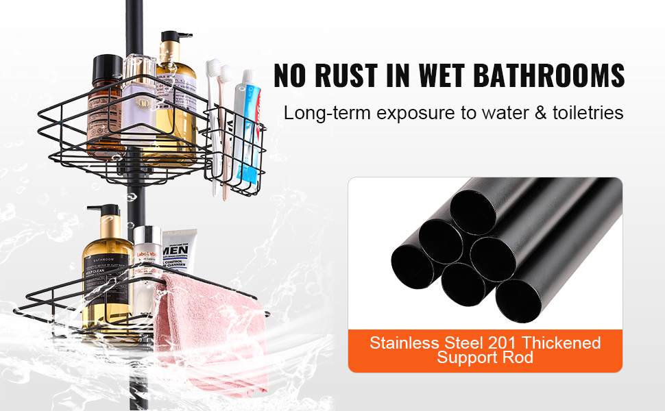 Kúpeľňový organizér napínacej tyče sprchového kúta je vyrobený z vysokokvalitnej nehrdzavejúcej ocele, ktorá je odolná proti korózii a robustná. Aj keď je dlhodobo ponorený vo vode alebo v častom kontakte s toaletnými potrebami, je stále ako nový.
