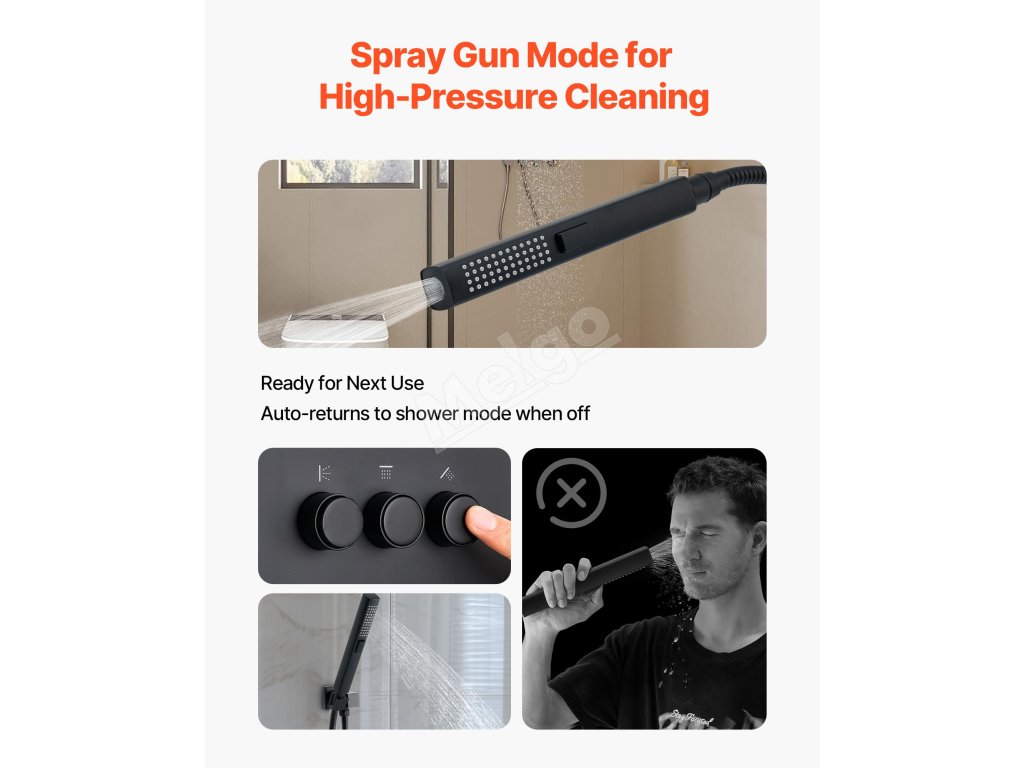 V tomto systéme dažďovej sprchy sa ručný prúd po zatvorení automaticky vráti do režimu sprchovania, čím sa zabráni náhodnému striekaniu pri ďalšom použití.