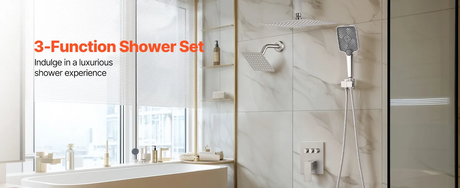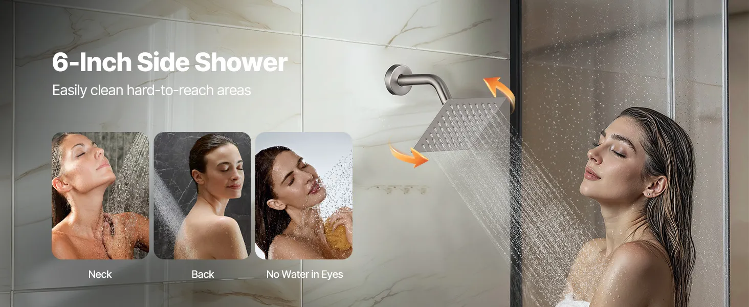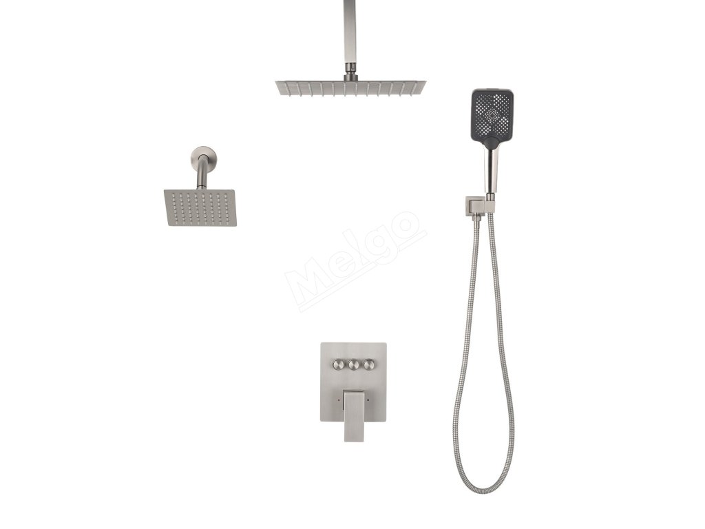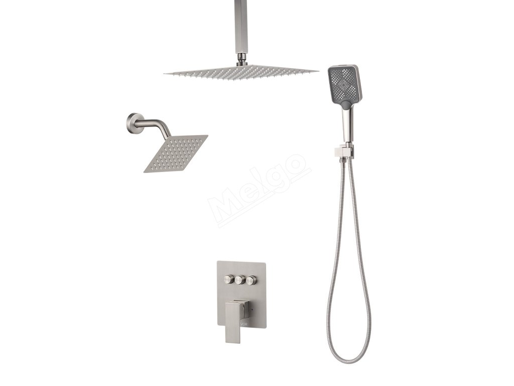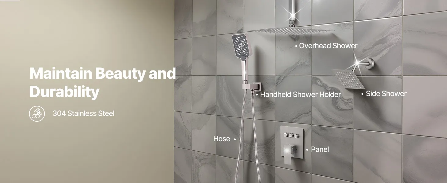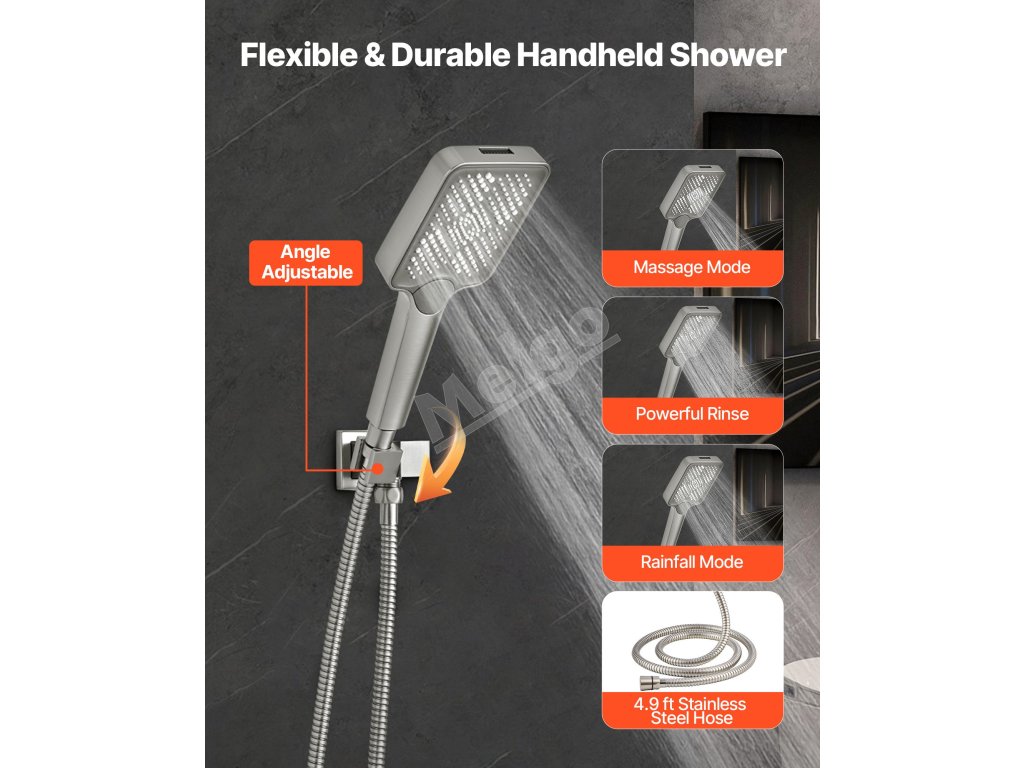 Naša súprava sprchových batérií ukrýva vodovodné potrubie za stenou, čím vytvára elegantný, špičkový vzhľad kúpeľne. Obsahuje 3 osviežujúce funkcie sprchy - ručnú, bočnú a hlavovú - na vylepšenie zážitku pre celé telo.