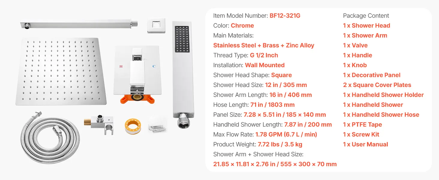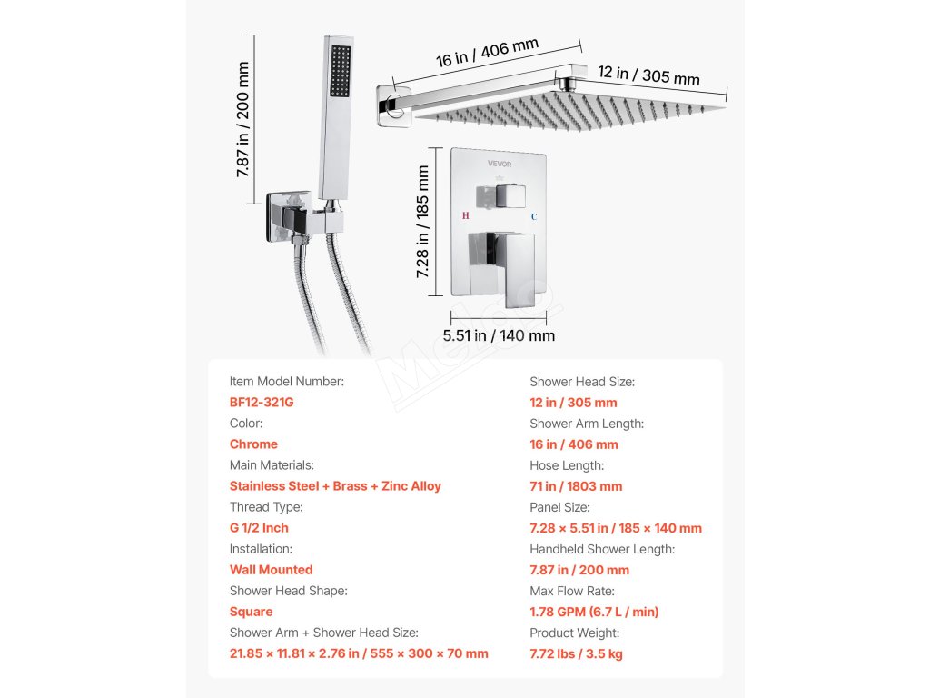 | Veľkosť sprchovej hlavice | 12 palcov/305 mm |