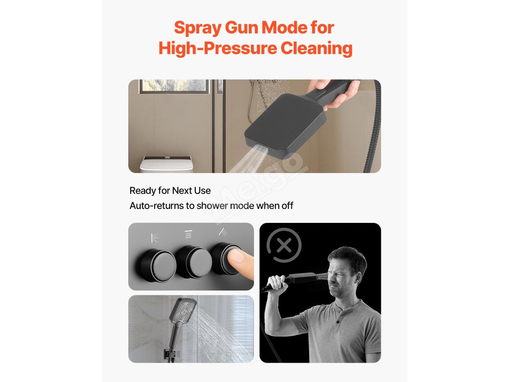 V tomto systéme dažďovej sprchy sa ručný prúd po zatvorení automaticky vráti do režimu sprchovania, čím sa zabráni náhodnému striekaniu pri ďalšom použití.