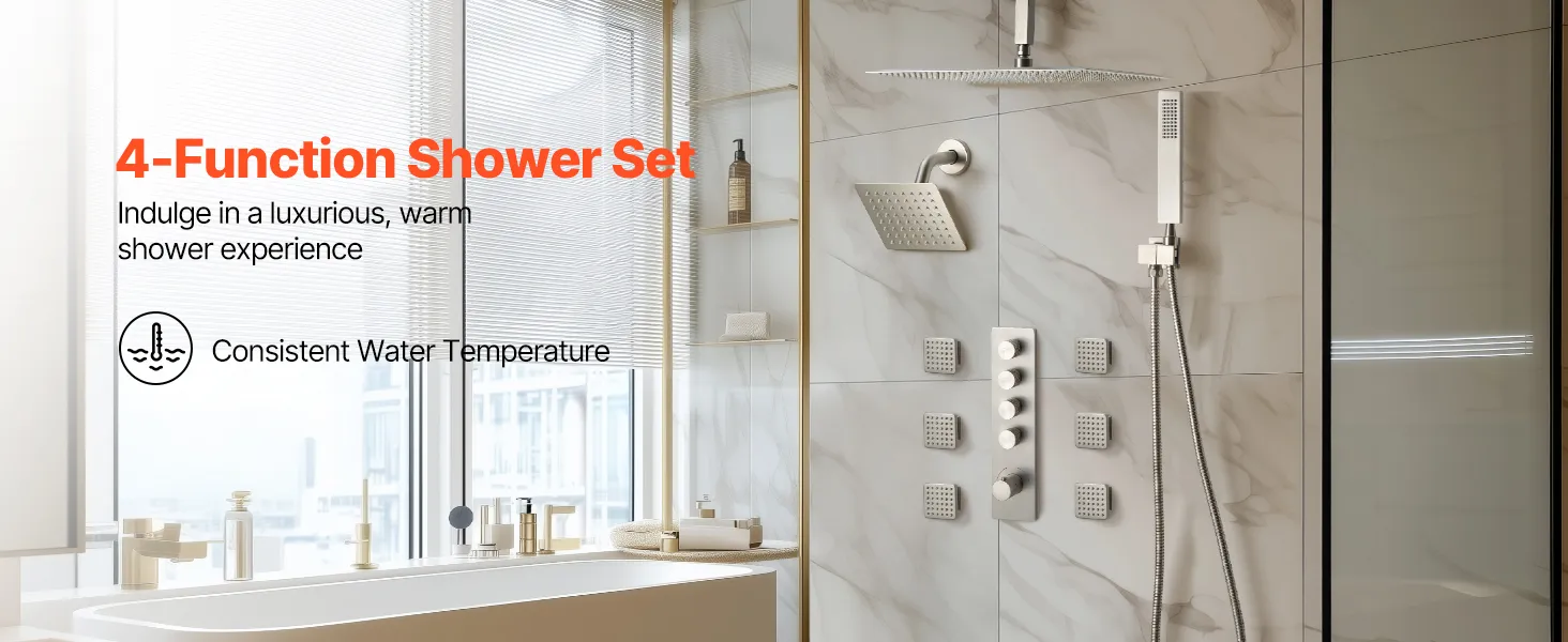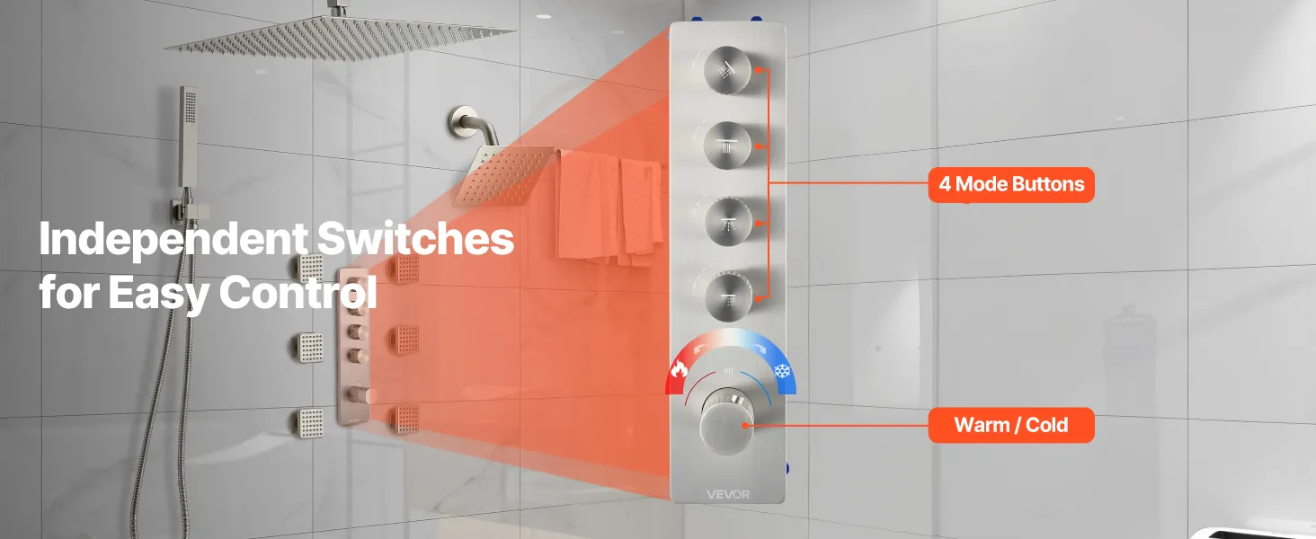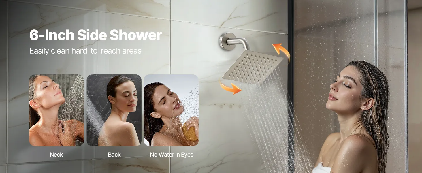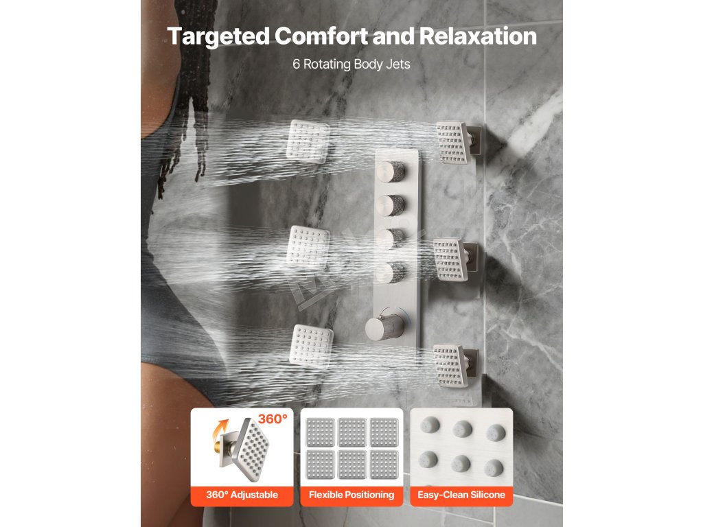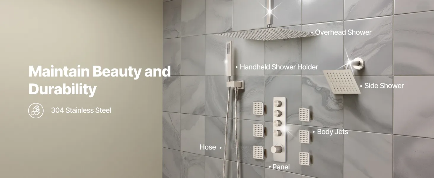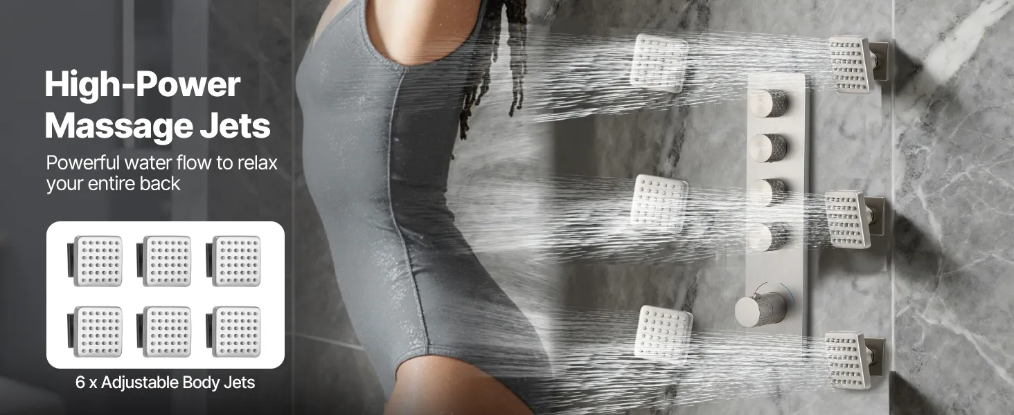 Naša súprava sprchových batérií ukrýva vodovodné potrubie za stenou, čím vytvára elegantný, špičkový vzhľad kúpeľne. Obsahuje 4 osviežujúce funkcie sprchy - 6 telových trysiek, hornú sprchu, bočnú sprchu a ručnú sprchu - na vylepšenie zážitku z celého tela.