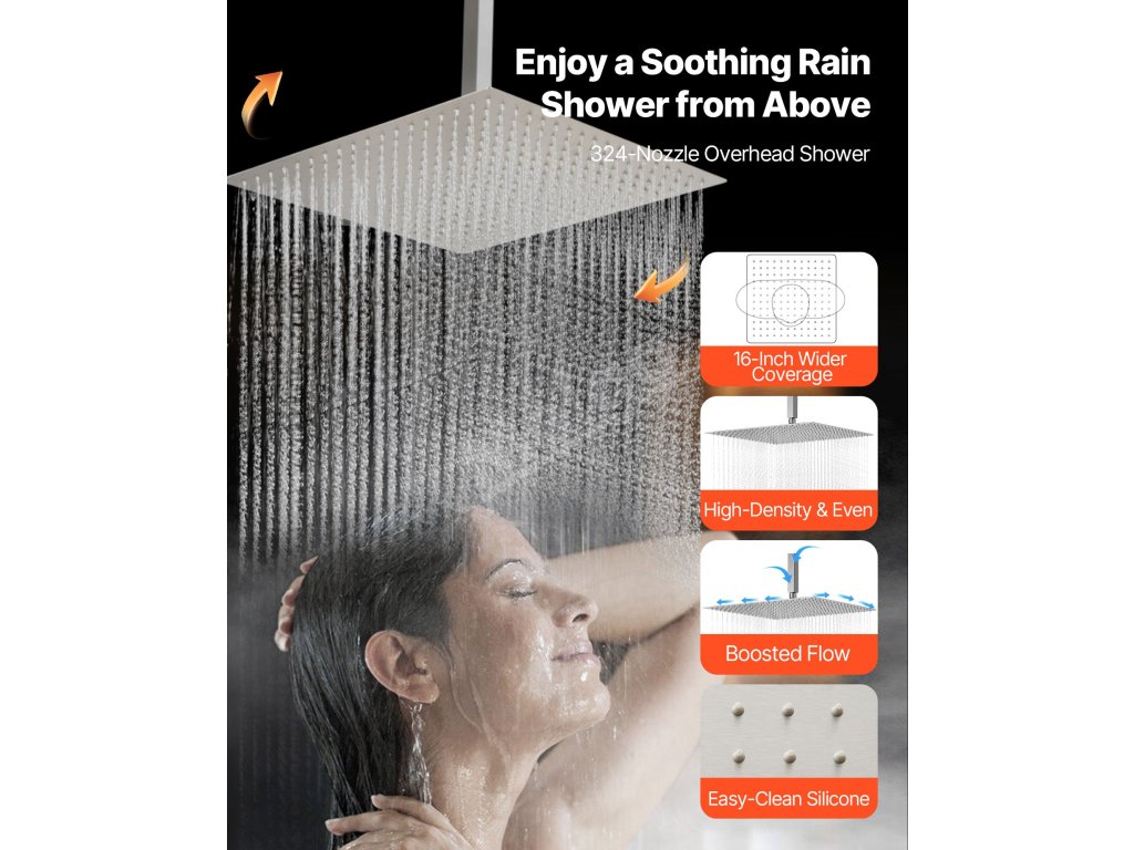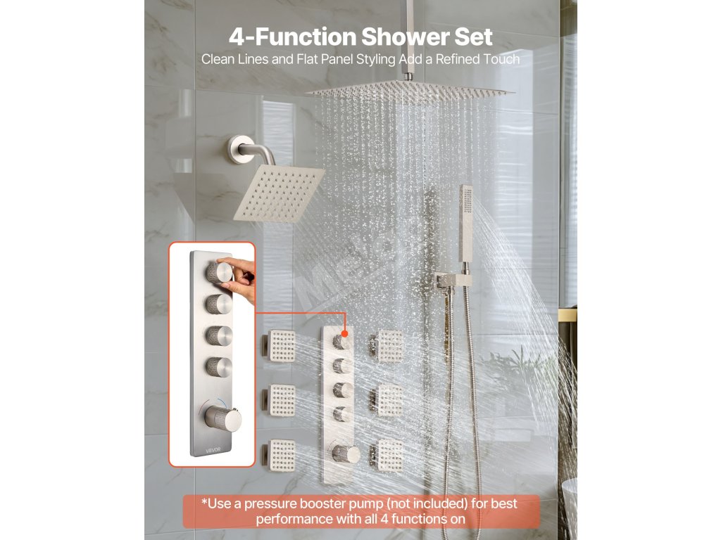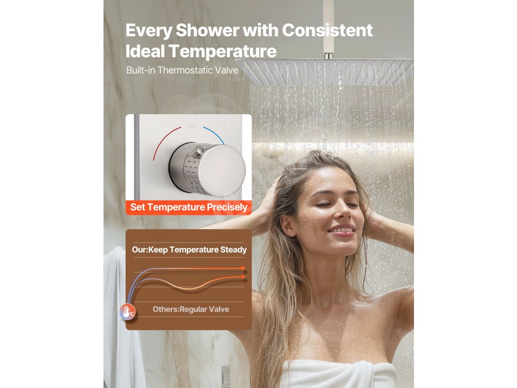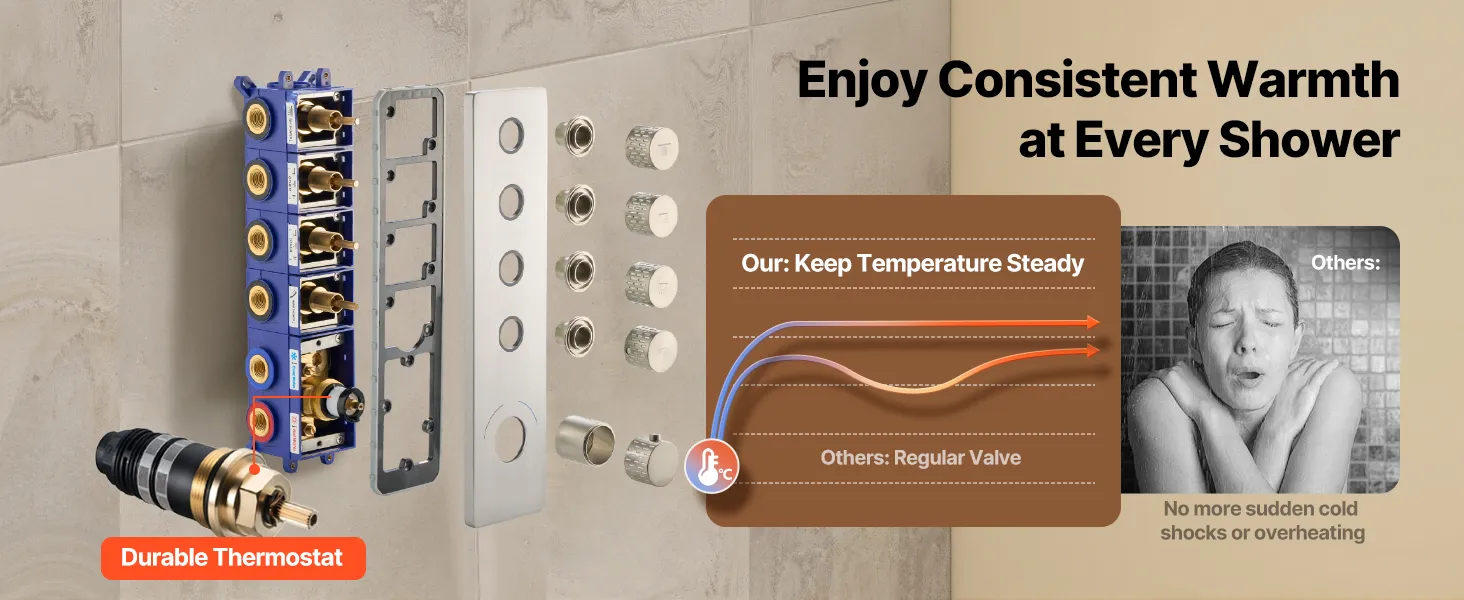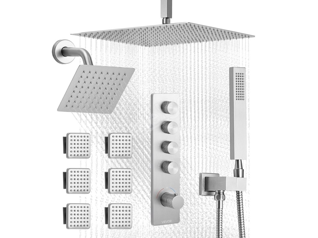 Naša súprava sprchových batérií ukrýva vodovodné potrubie za stenou, čím vytvára elegantný, špičkový vzhľad kúpeľne. Obsahuje 4 osviežujúce funkcie sprchy - 6 telových trysiek, hornú sprchu, bočnú sprchu a ručnú sprchu - na vylepšenie zážitku z celého tela.