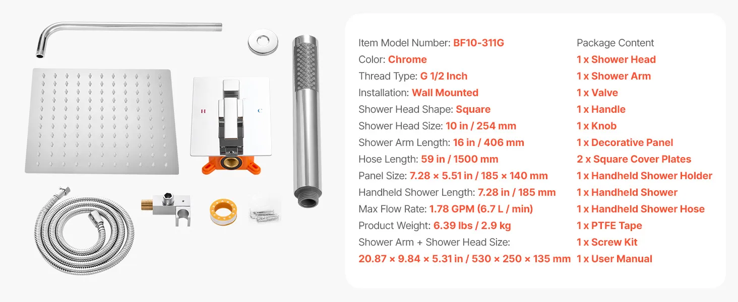 | Veľkosť sprchového ramena + sprchovej hlavice | 20.87 x 9,84 x 5,31 in/530 x 250 x 135 mm |