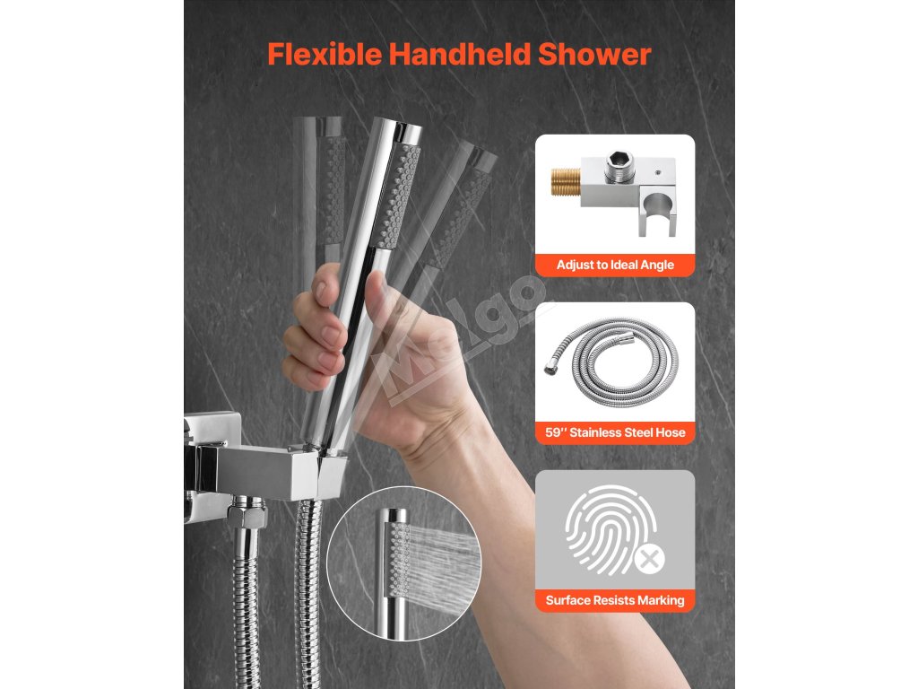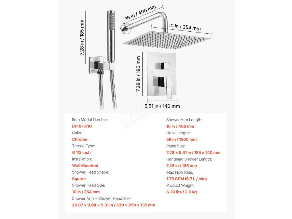 | Veľkosť sprchového ramena + sprchovej hlavice | 20.87 x 9,84 x 5,31 in/530 x 250 x 135 mm |