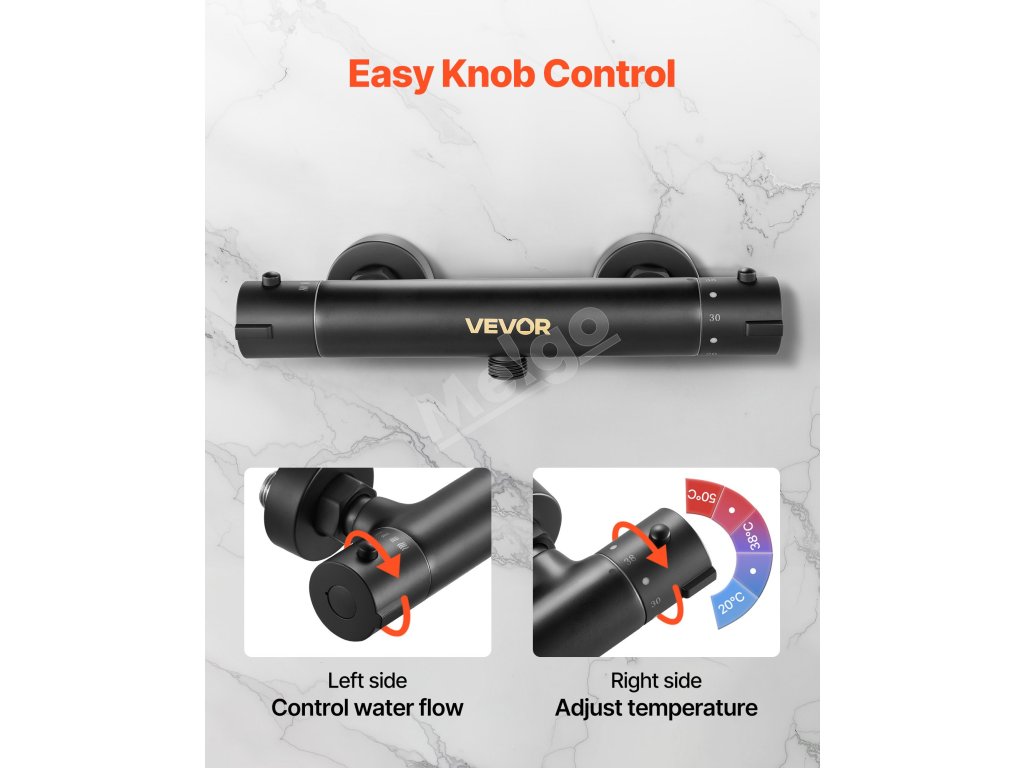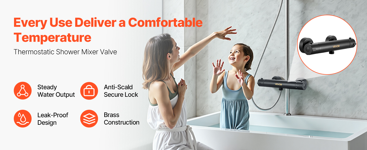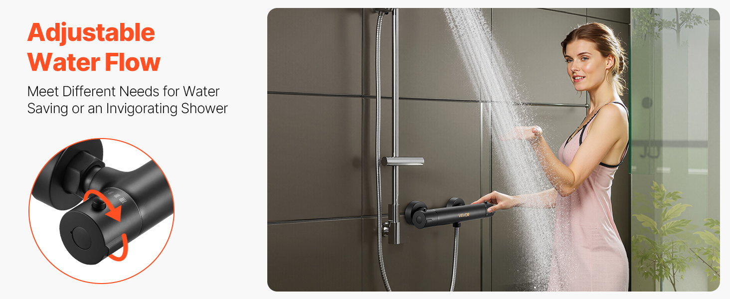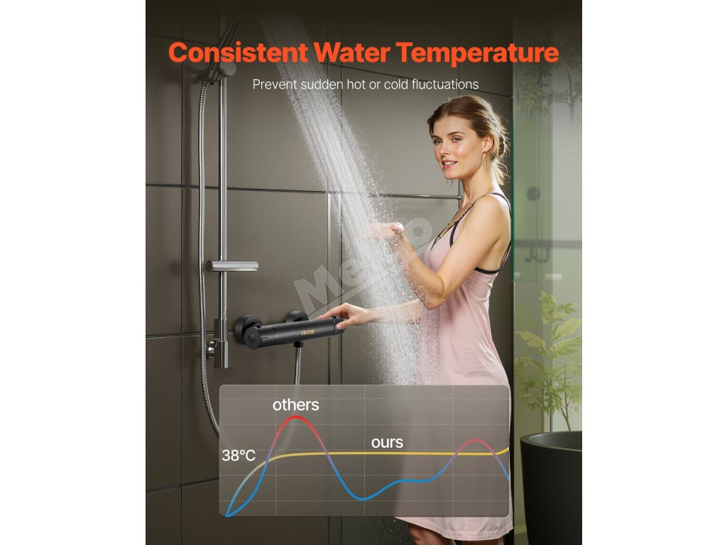 Termostatický zmiešavací ventil VEVOR je vybavený dvoma gombíkmi na ovládanie teploty aj prietoku. Či už uprednostňujete jemné oplachovanie alebo silný prúd, poskytuje stabilný výstup vody pri každom sprchovaní. Perfektne spĺňa potreby vašej rodiny s plynulým a spoľahlivým výkonom.