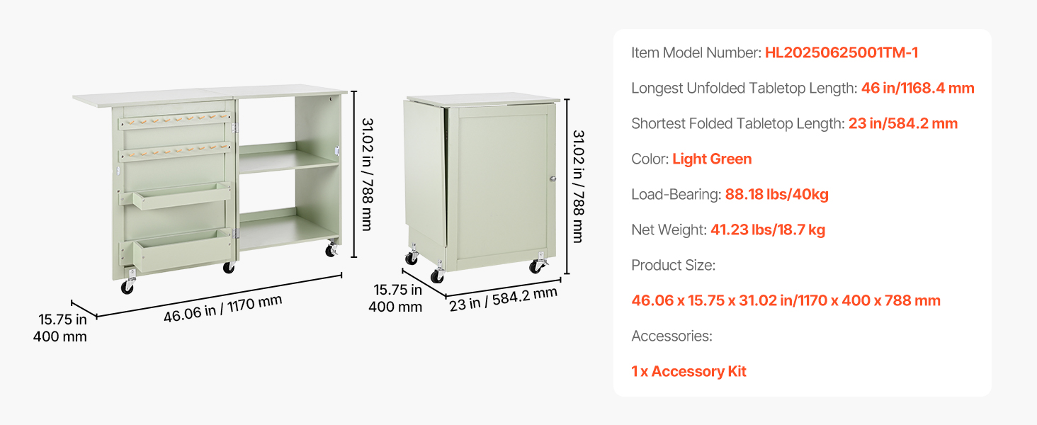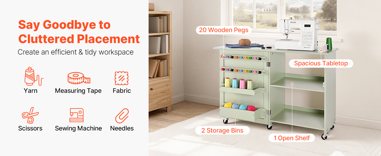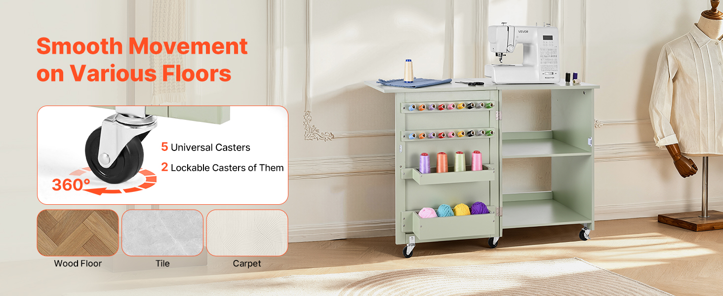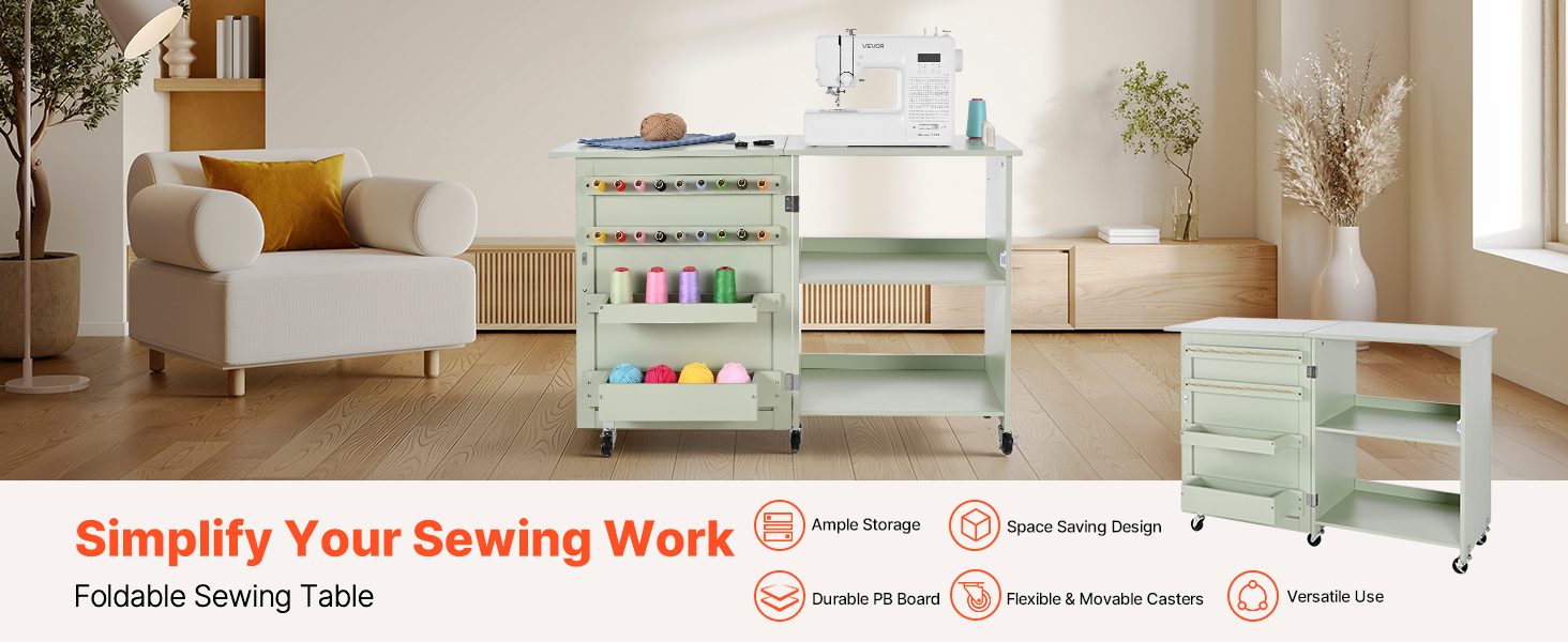 Tento skladací šijací stôl poskytuje dostatok úložného priestoru, ktorý umožňuje jednoduché usporiadanie šijacích nástrojov a materiálov. Jeho skladacia konštrukcia šetrí miesto, keď sa nepoužíva, zatiaľ čo flexibilné kolieska sa ľahko pohybujú. Je vyrobený z PB dosky a je odolný proti opotrebovaniu. Dobre sa hodí aj ako pracovný alebo výstavný stolík.