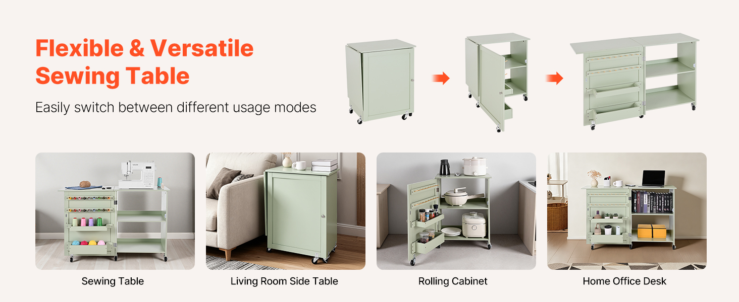 Tento šijací stôl so skladacou konštrukciou nie je len šijacím stolíkom, ale dá sa ľahko premeniť aj na príručný stolík, čím mu dodáva praktickosť a krásu. Slúži aj ako otočná skrinka, ktorá poskytuje praktický úložný priestor, alebo ako stôl do domácej kancelárie, čím vám uľahčí každodennú prácu a štúdium.