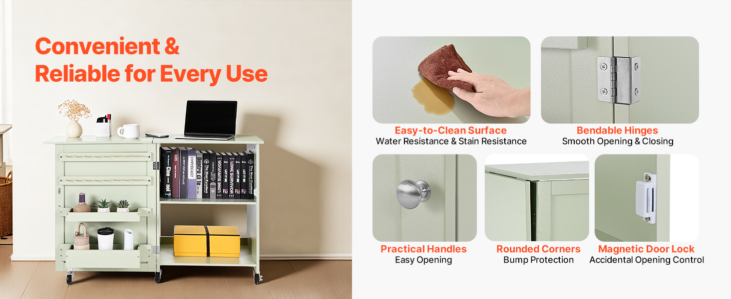 Tento šijací stôl s úložným priestorom má vodoodolný povrch odolný voči škvrnám na jednoduché čistenie, ohybné pánty na odolné a hladké otváranie/zatváranie a rukoväť na ľahký prístup do skrinky/zásuvky. Jeho zaoblené rohy zabraňujú nárazom a magnetický zámok dvierok zabraňuje náhodnému otvoreniu dvierok.
