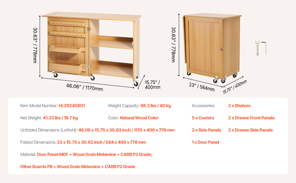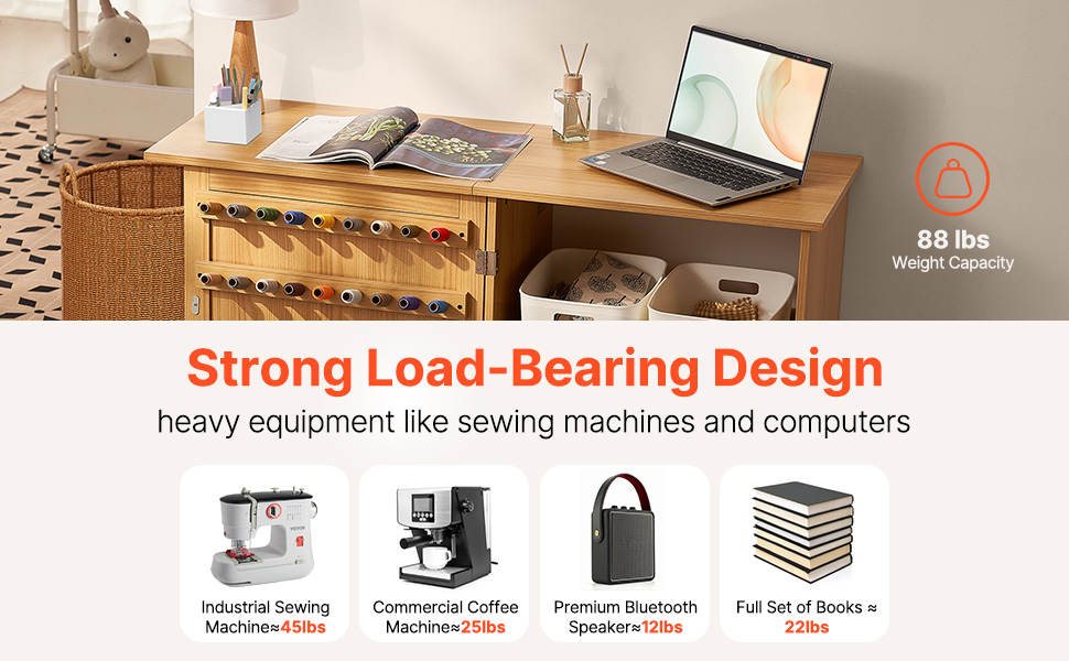 Tento šijací stôl s úložným priestorom má pevnú nosnosť 88 libier, vďaka čomu spoľahlivo udrží väčšie šijacie stroje a potreby bez obáv z nestability. Okrem toho súprava obsahuje dve externé odkladacie plochy s nosnosťou 3,31 lbs.