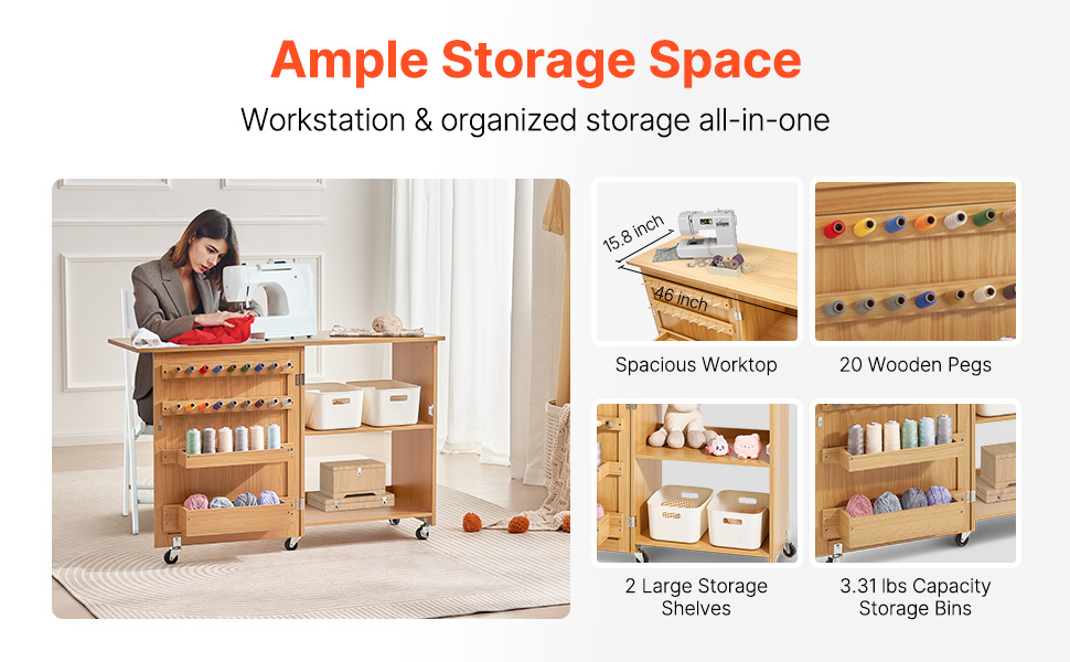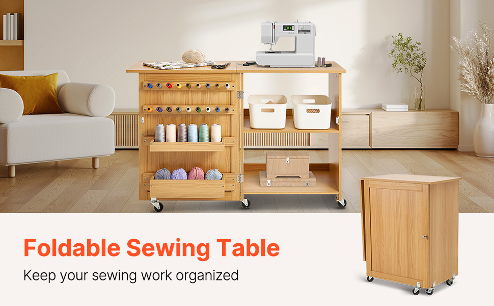 Tento stôl na šijacie stroje so skladacou konštrukciou a deleným úložným priestorom unesie až 88 kg. Je ideálny na každodenné používanie ako šijacia stanica alebo kancelársky stôl a keď sa nepoužíva, možno ho ľahko zložiť do bočnej skrinky na uloženie rôznych predmetov.