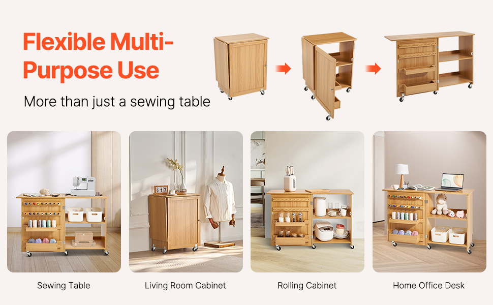 Keď sa potrebujete pustiť do práce, jednoducho odklopte stolovú dosku a použite šijací stôl ako šijací alebo kancelársky. Keď ho nepoužívate, zložte ho a uložte ako praktickú skrinku na každodenné veci.