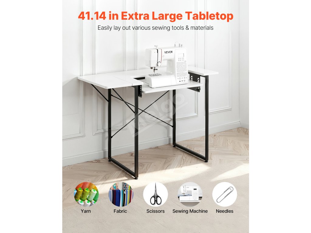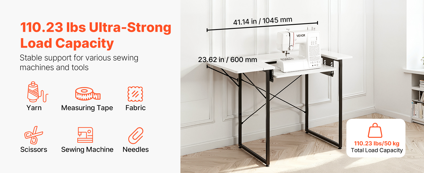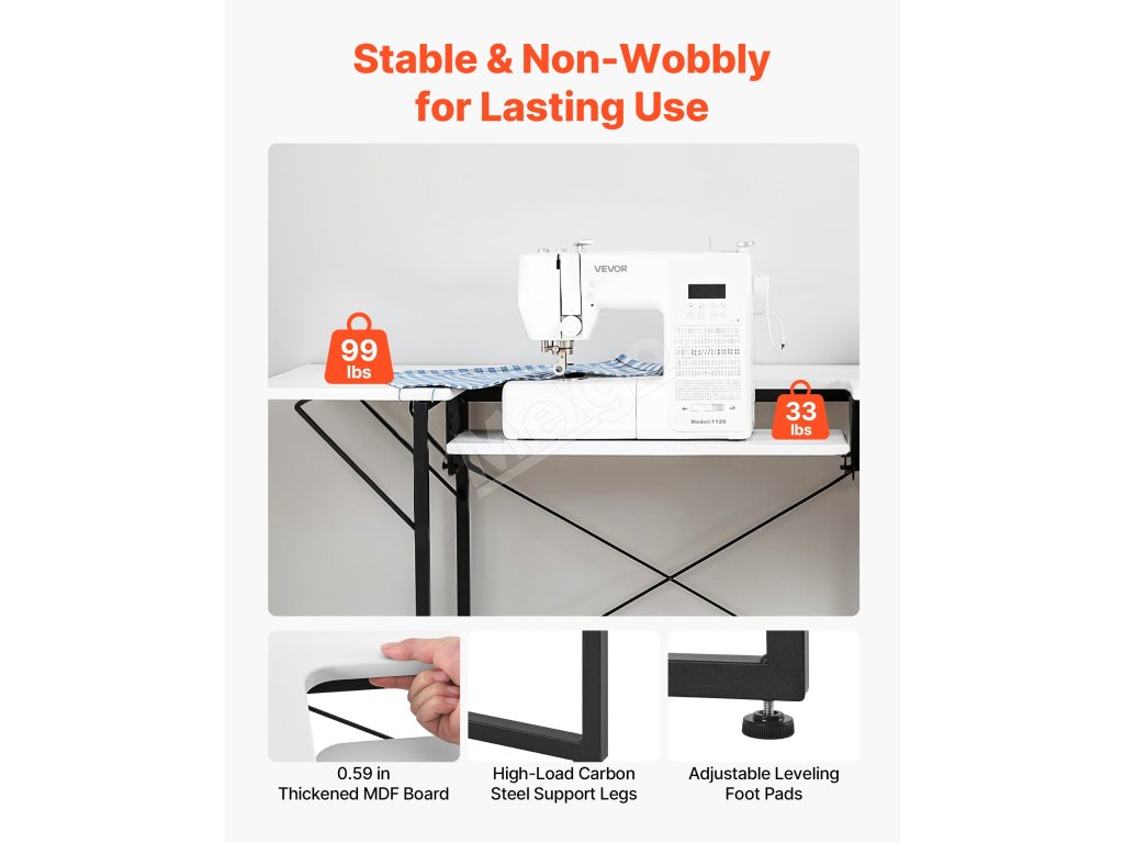 Tento stôl na šijacie stroje poskytuje silnú nosnosť 110,23 lbs/50 kg, stabilne udrží veľké šijacie stroje a rôzne nástroje. Jeho priestranná pracovná plocha poskytuje dostatok pracovného priestoru, na ktorý sa ľahko zmestia priadze, látky, nožnice, šijacie stroje a špendlíky.