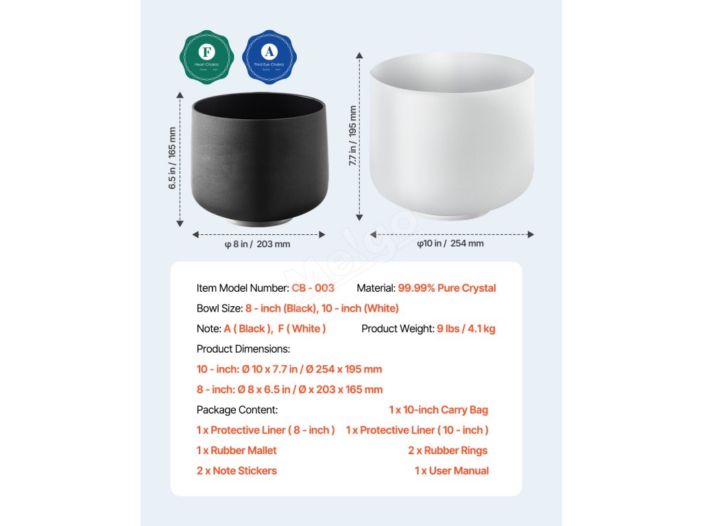 8-palcové a 10-palcové krištáľové spievajúce misy VEVOR rezonujú tónmi A a F, čím vyrovnávajú tretie oko a srdcovú čakru, upokojujú vašu myseľ a podporujú vnútorný pokoj. Sú vyrobené z 99,99 % čistého krištáľu, vďaka čírym tónom a dlhotrvajúcej rezonancii sú ideálne na jogu, meditáciu a relaxáciu.