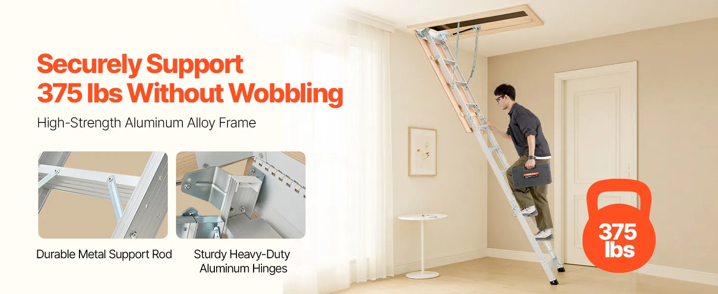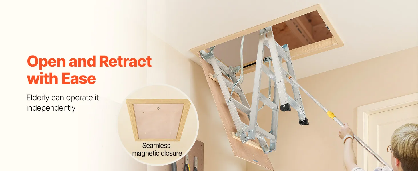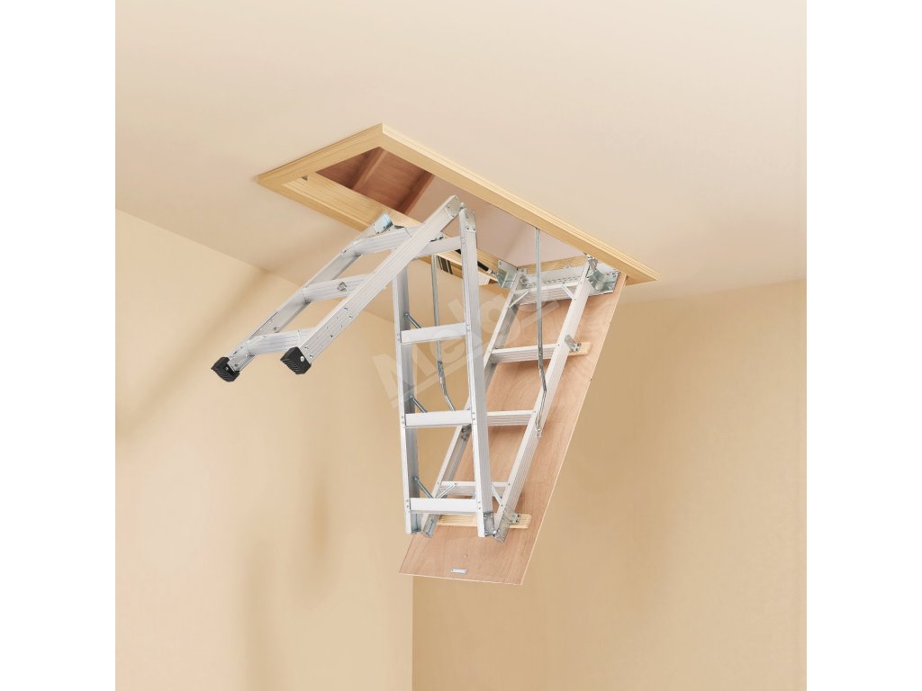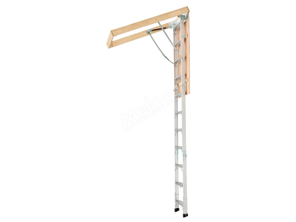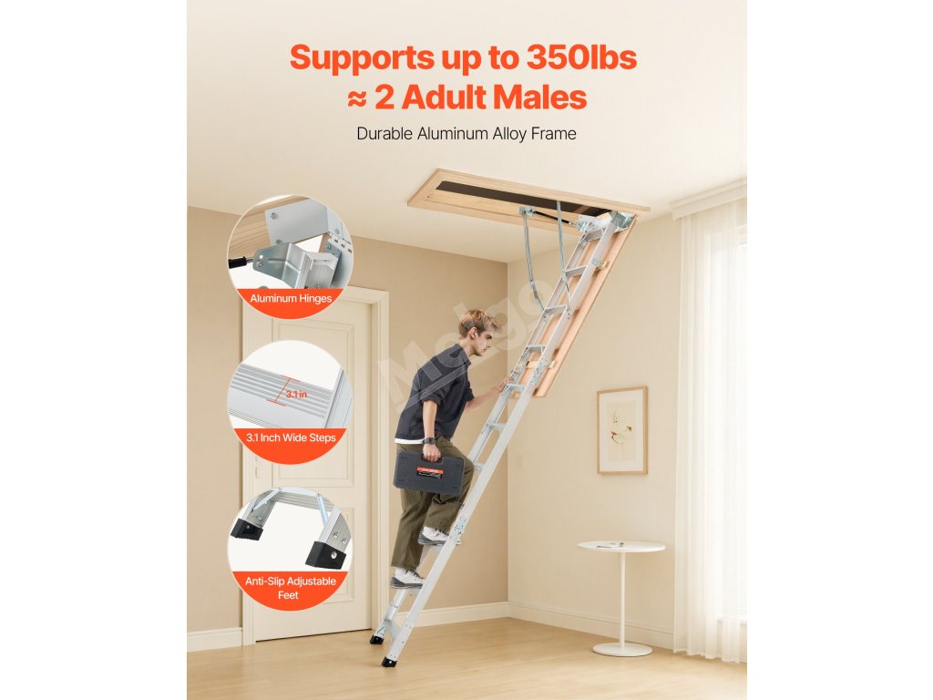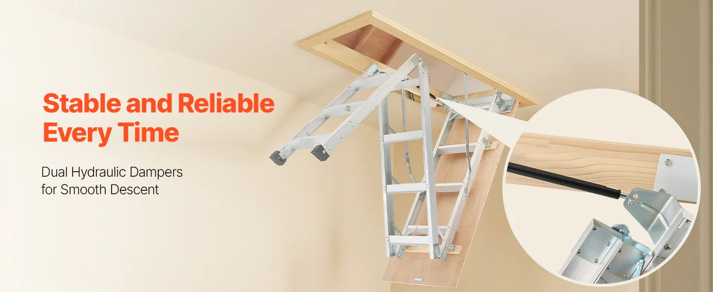 Podkrovný rebrík má 2 inštalačné výšky (9,8-10,3 ft / 7,66-9,8 ft), dá sa skrátiť pomocou píly a možno ho zložiť do rozmerov 53,9 × 22,4 × 9,2 palca. Dvojité hydraulické tyče zabezpečujú bezproblémové používanie. Dodáva sa s ťažnou tyčou, krúžkom a magnetickými dvierkami na jednoduché, skryté skladanie. S hliníkovým telom a 3,1-palcovými schodíkmi unesie 375 libier.