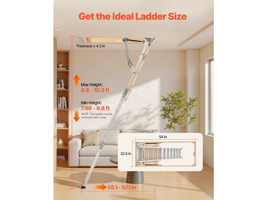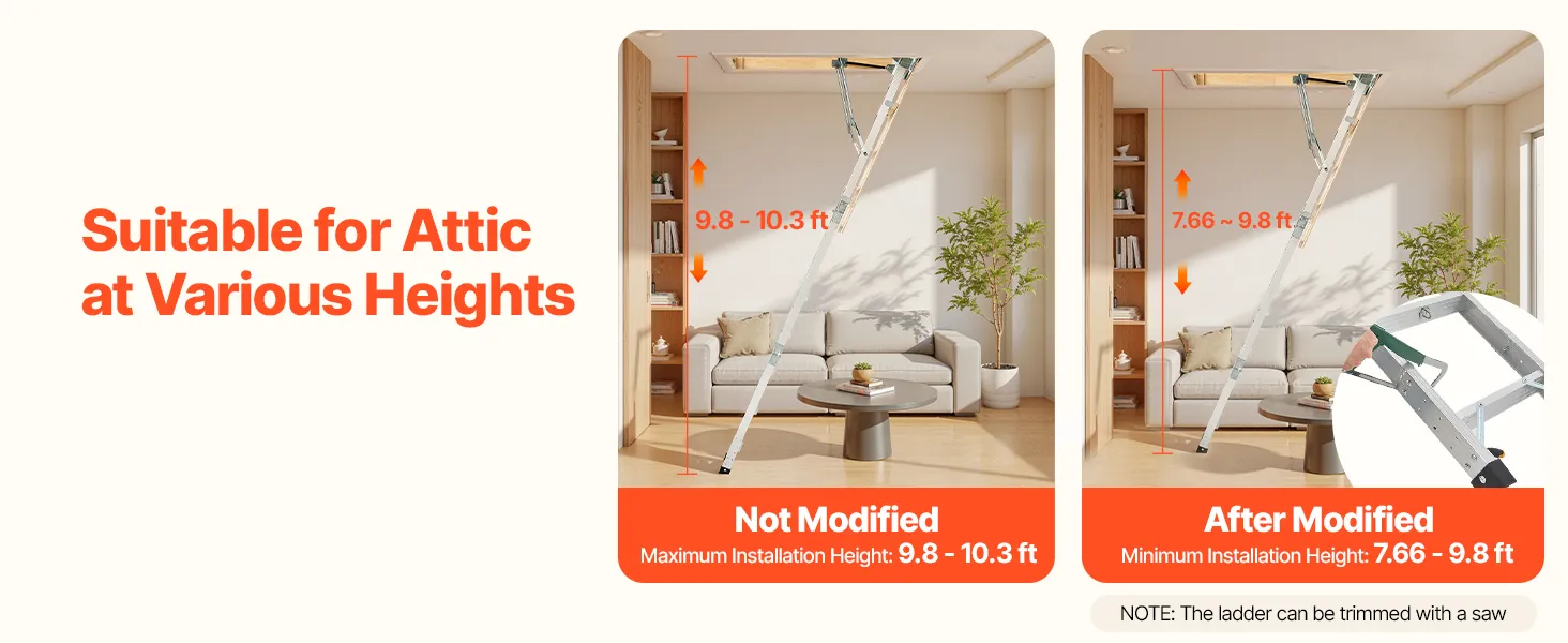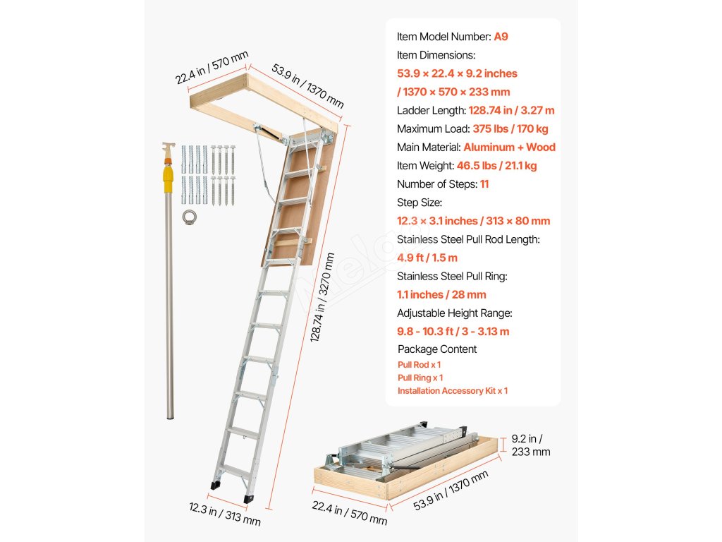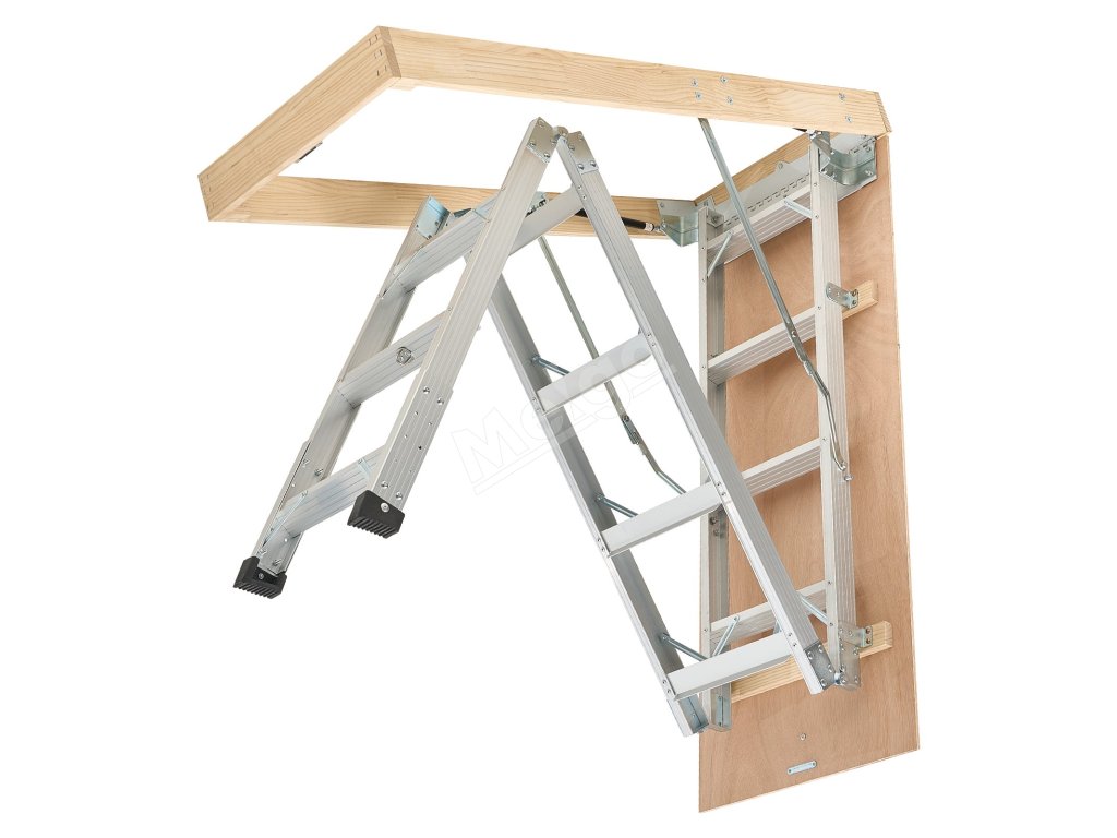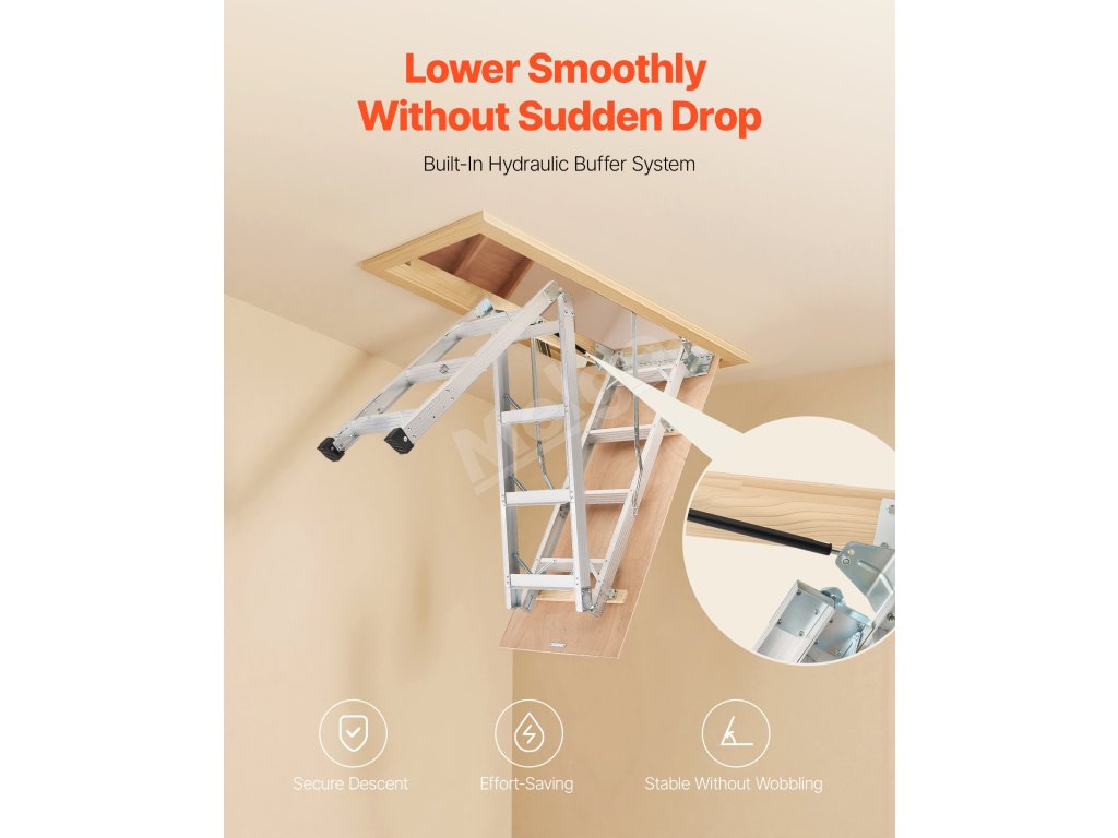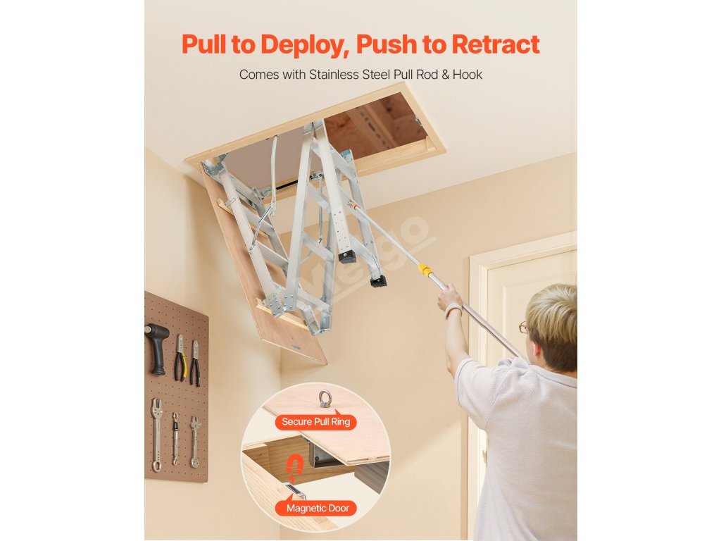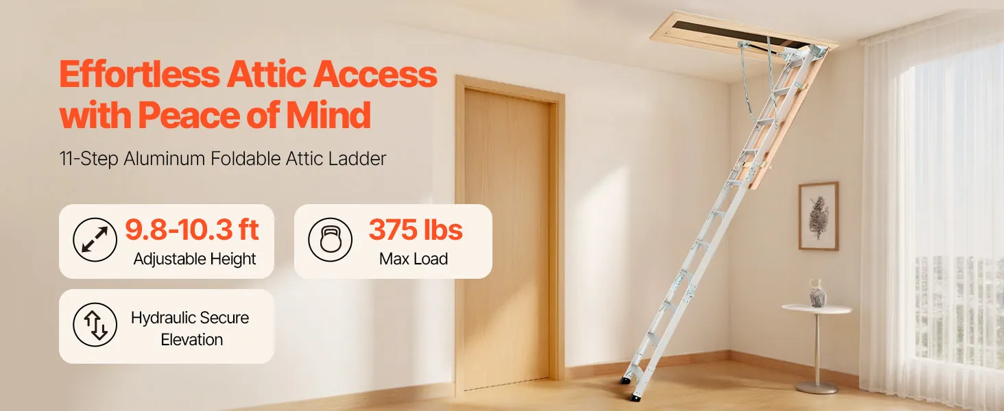Podkrovný rebrík má 2 inštalačné výšky (9,8-10,3 ft / 7,66-9,8 ft), dá sa skrátiť pomocou píly a možno ho zložiť do rozmerov 53,9 × 22,4 × 9,2 palca. Dvojité hydraulické tyče zabezpečujú bezproblémové používanie. Dodáva sa s ťažnou tyčou, krúžkom a magnetickými dvierkami na jednoduché, skryté skladanie. S hliníkovým telom a 3,1-palcovými schodíkmi unesie 375 libier.