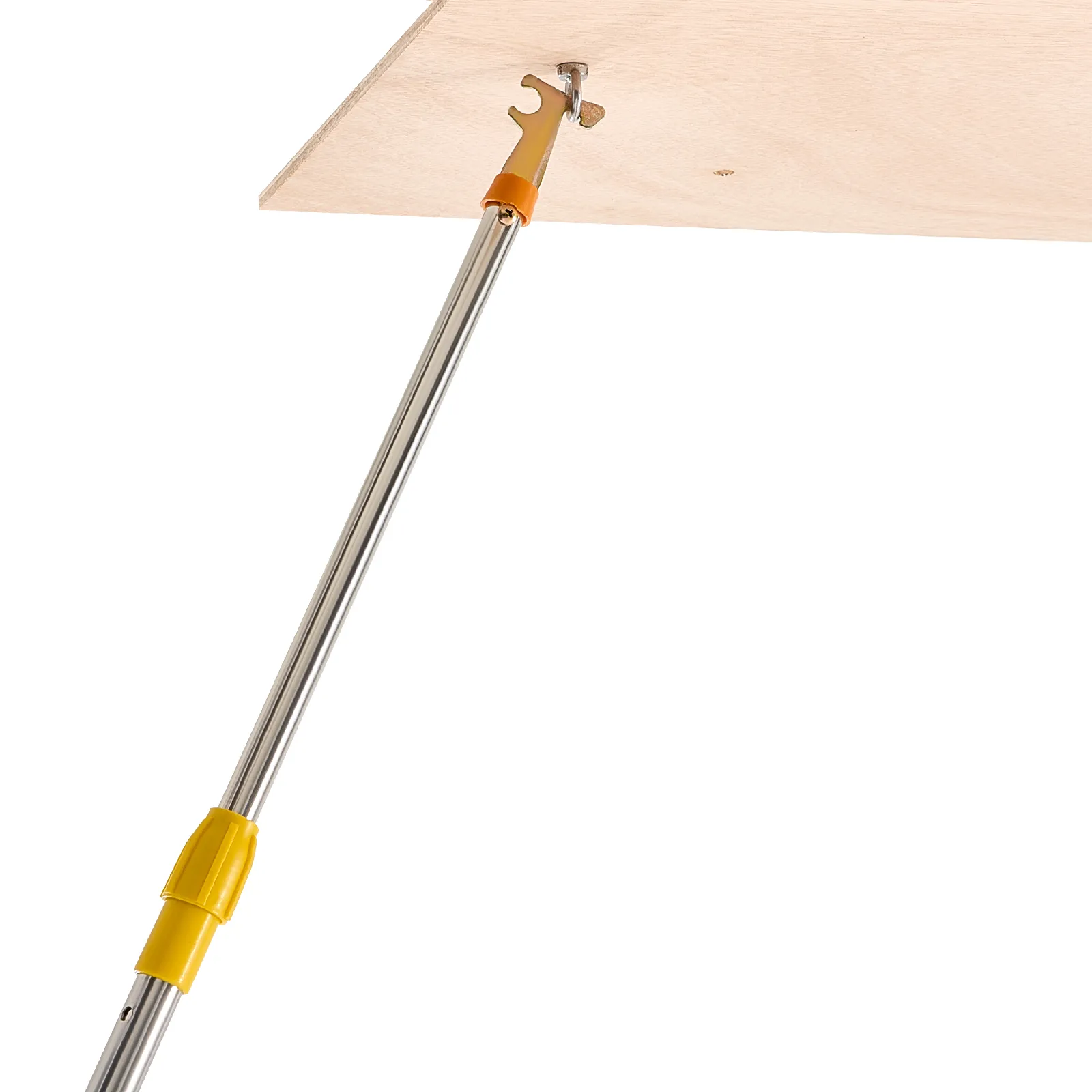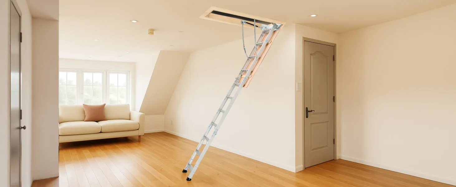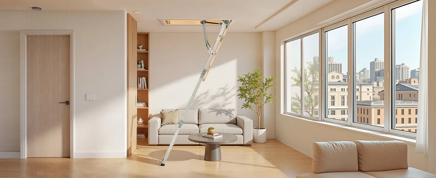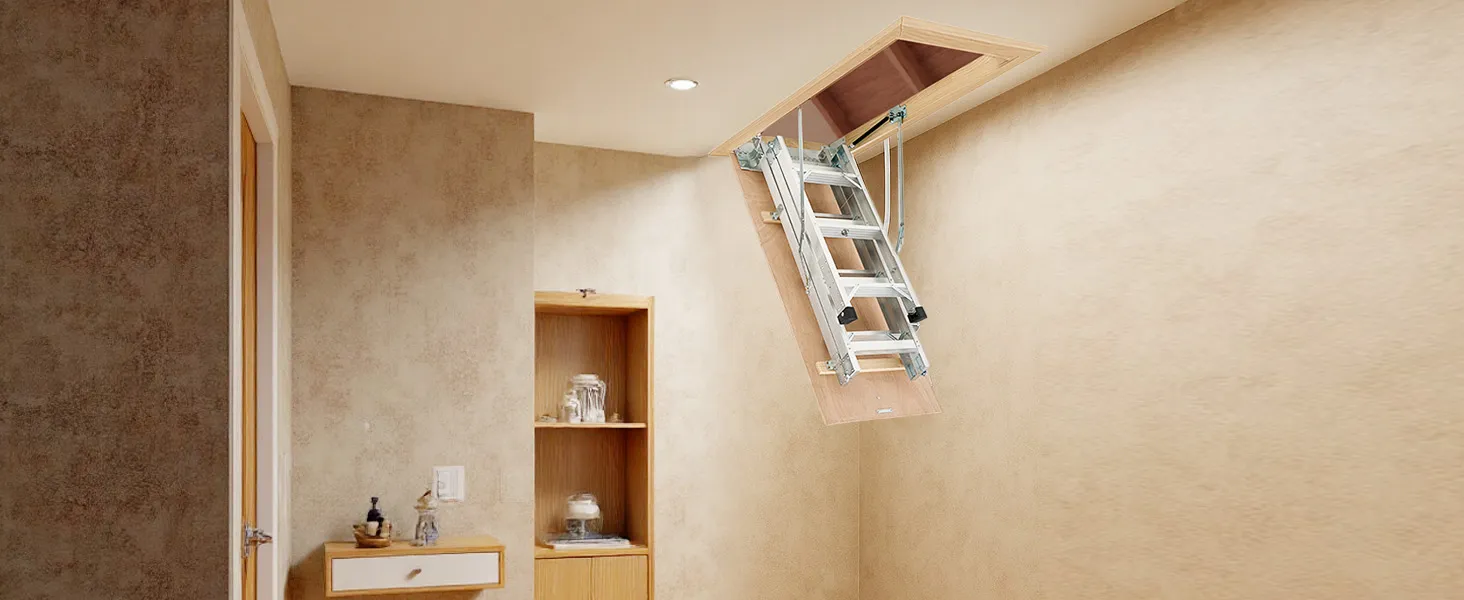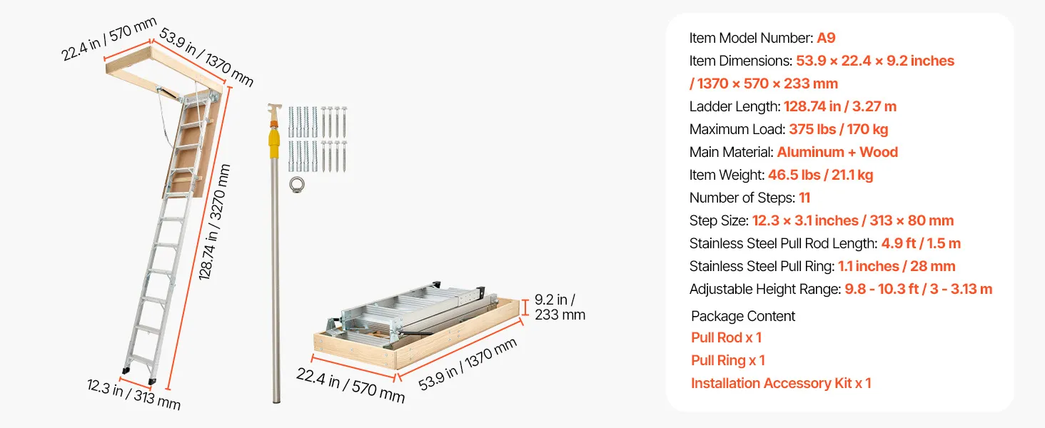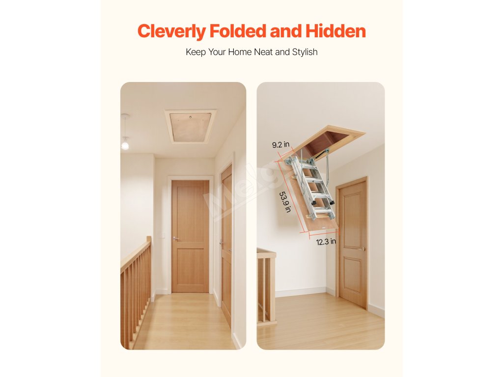Podkrovný rebrík má 2 inštalačné výšky (9,8-10,3 ft / 7,66-9,8 ft), dá sa skrátiť pomocou píly a možno ho zložiť do rozmerov 53,9 × 22,4 × 9,2 palca. Dvojité hydraulické tyče zabezpečujú bezproblémové používanie. Dodáva sa s ťažnou tyčou, krúžkom a magnetickými dvierkami na jednoduché, skryté skladanie. S hliníkovým telom a 3,1-palcovými schodíkmi unesie 375 libier.