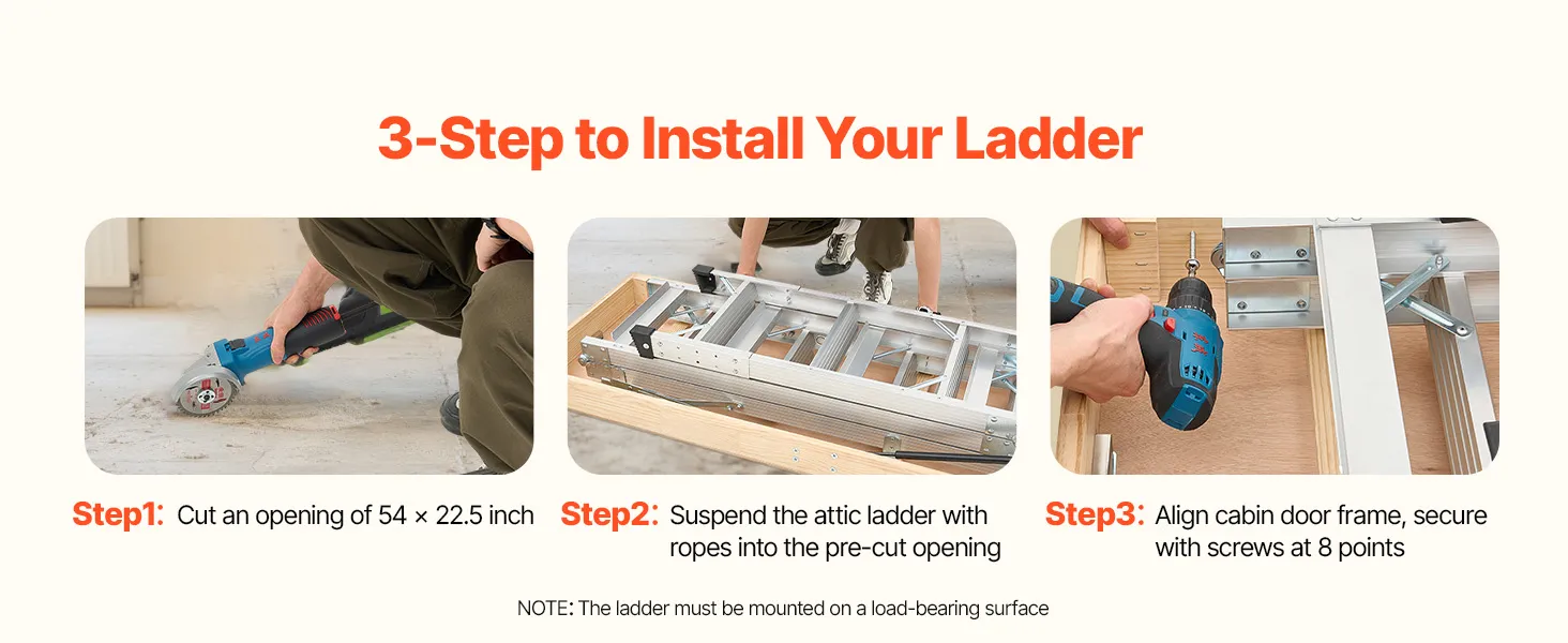 Vďaka nastaviteľným oporným pätkám, ktoré chránia vašu podlahu, veľkosti otvoru 54 x 22,5 palca a 2 možnostiam výšky (9,8-10,3 ft / 7,66-9,8 ft) sa tento rebrík hodí do rôznych priestorov. Na jeho inštaláciu sú potrebné len 3 kroky, pričom súčasťou balenia je podrobný návod.
