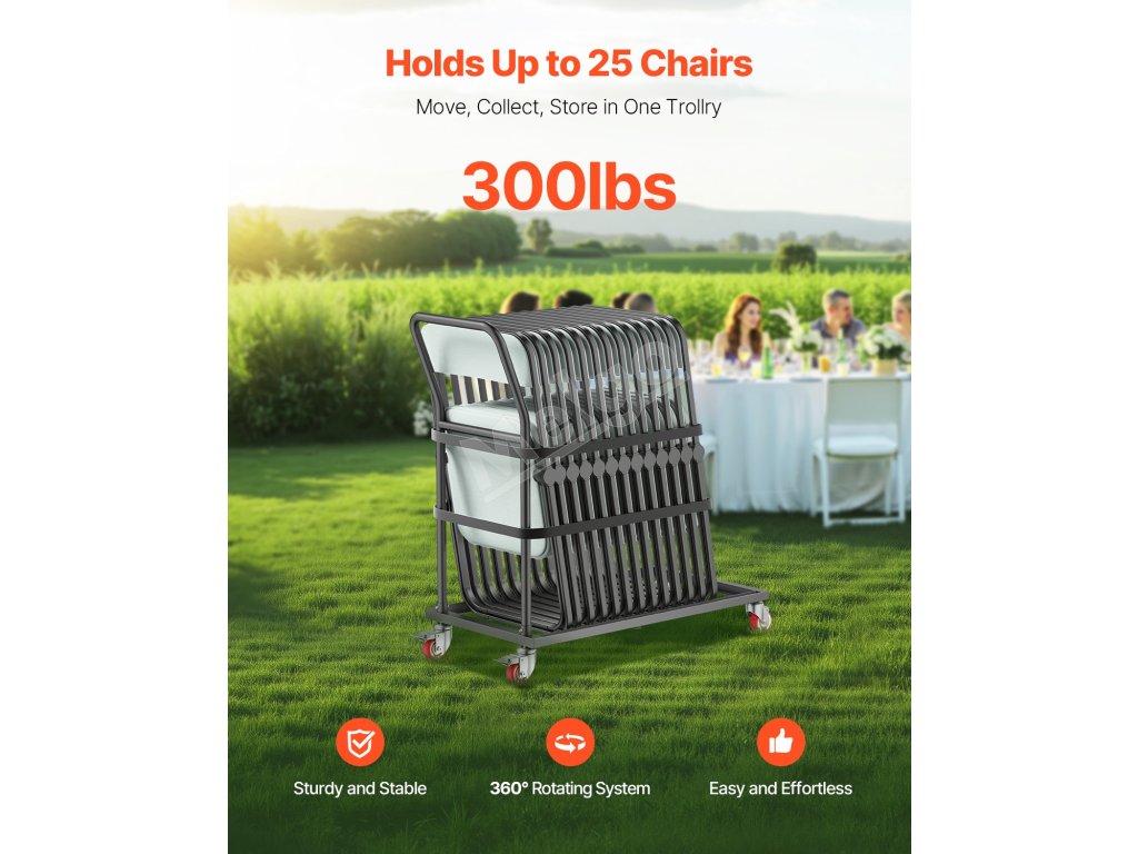 Vozík na skladacie stoličky, 300 LBS, pre 25 ks, kovový, kolieska
