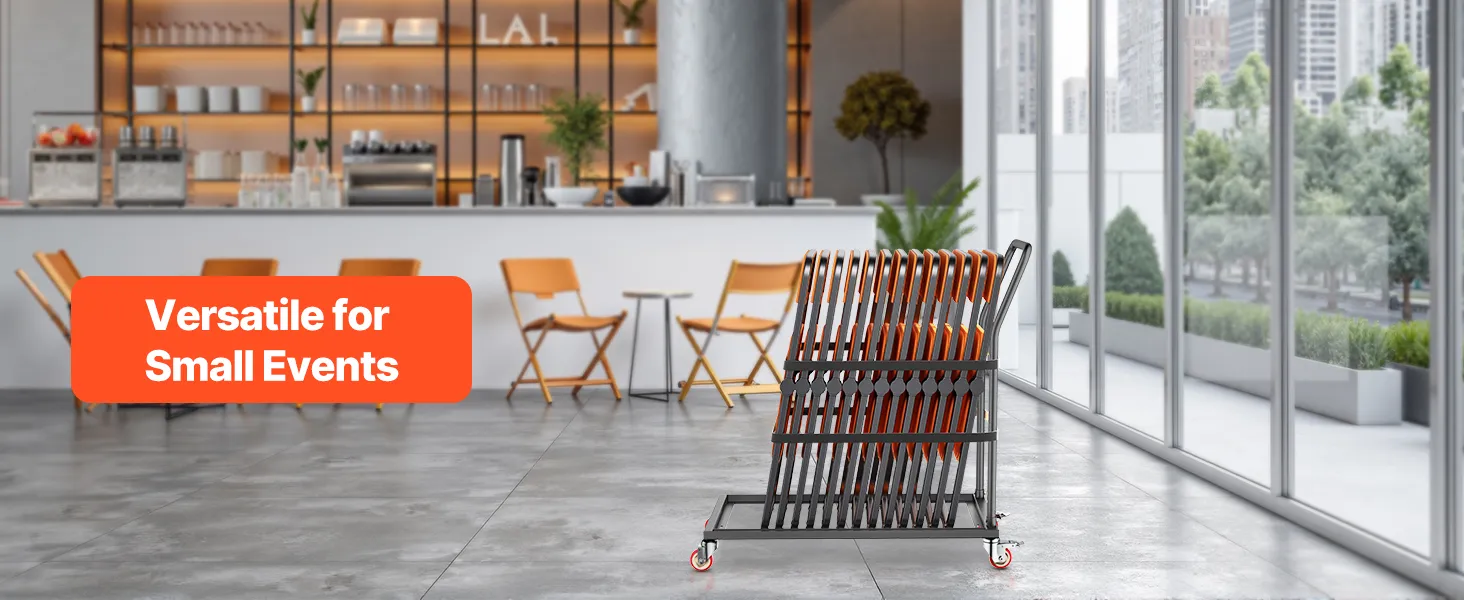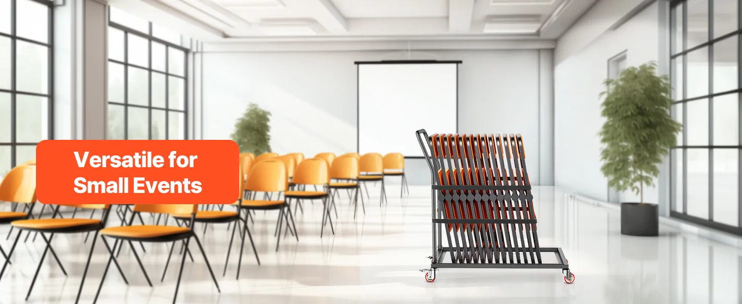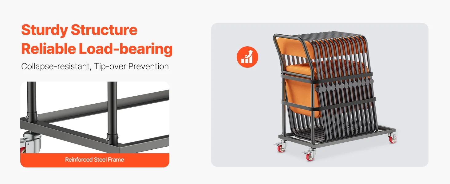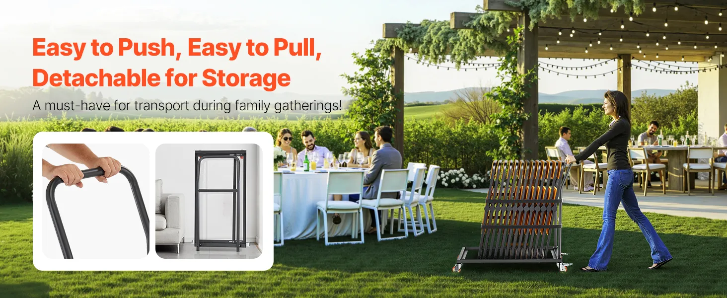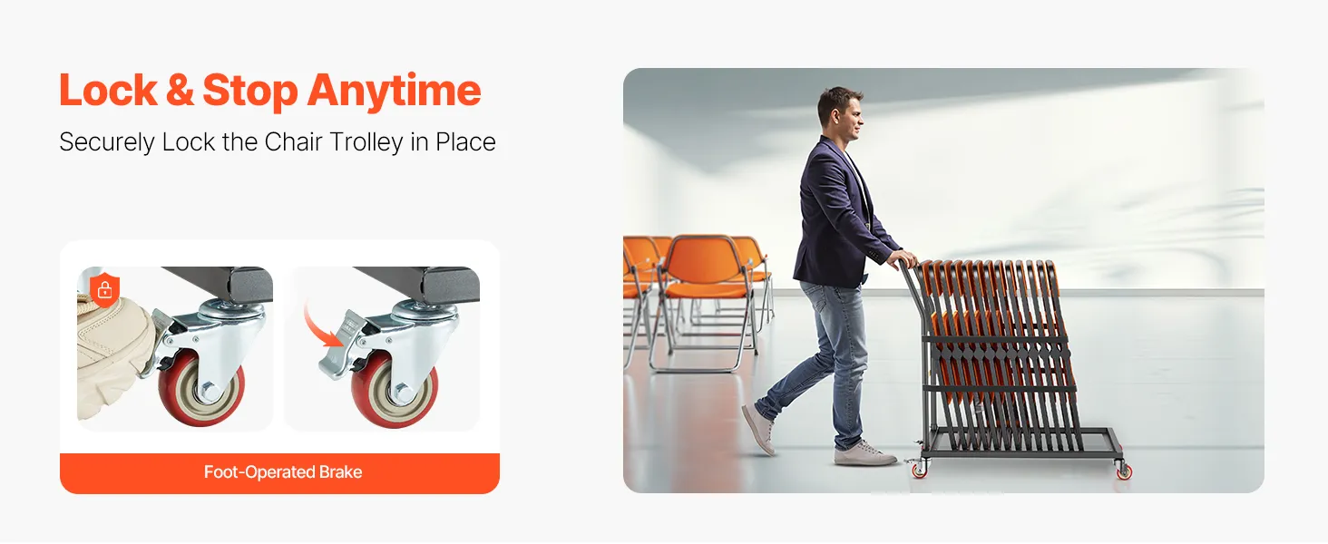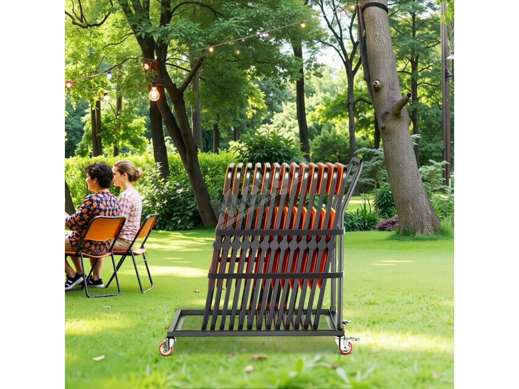 Tento vozík na jedálenské stoličky bez problémov kombinuje pohodlnú prepravu s priestorovo úsporným dizajnom, vďaka čomu je ideálny na rôzne podujatia, konferencie a iné. Je ideálnym riešením pre rodiny a školy, ktoré chcú efektívne usporiadať a uskladniť jedálenské stoličky.