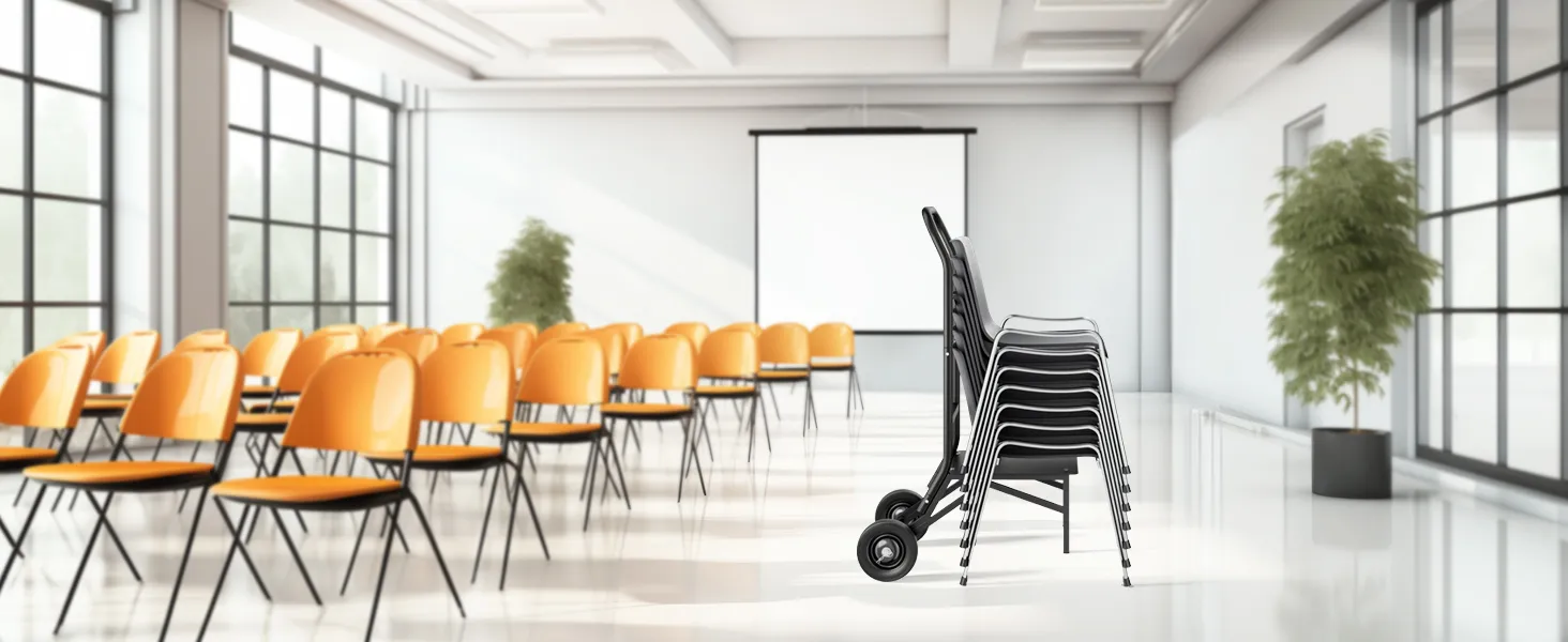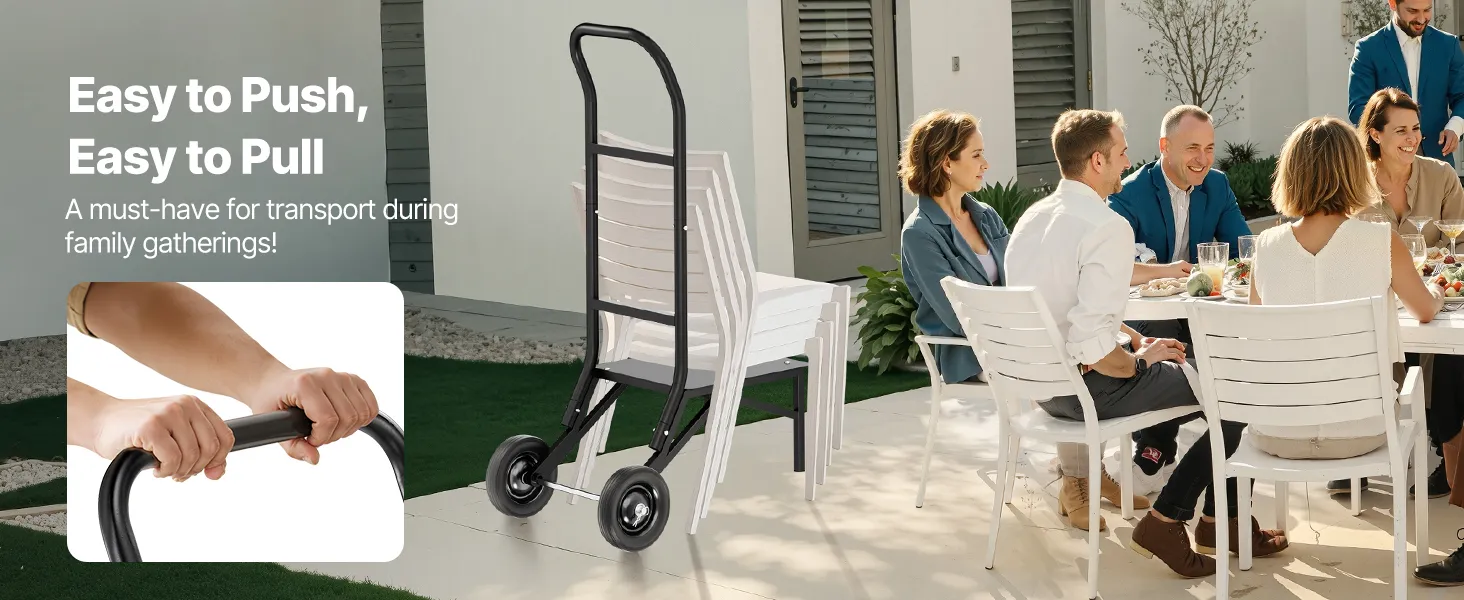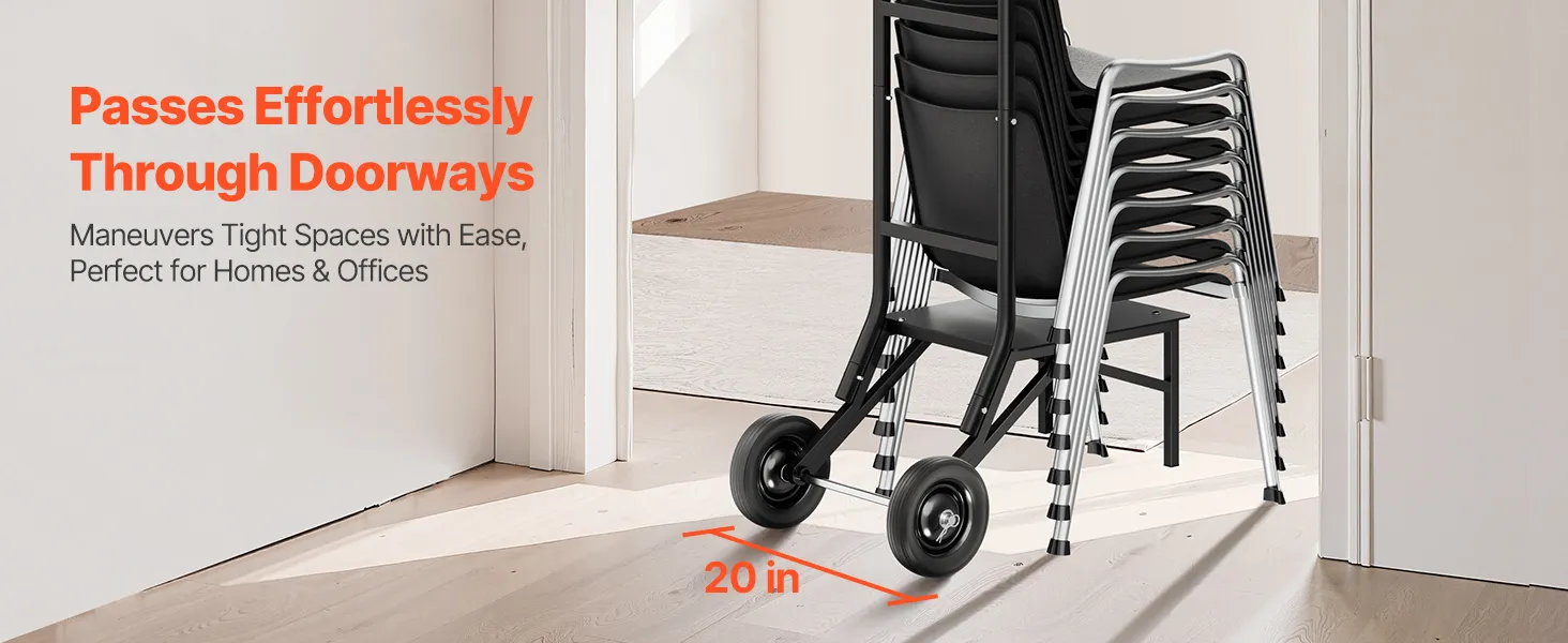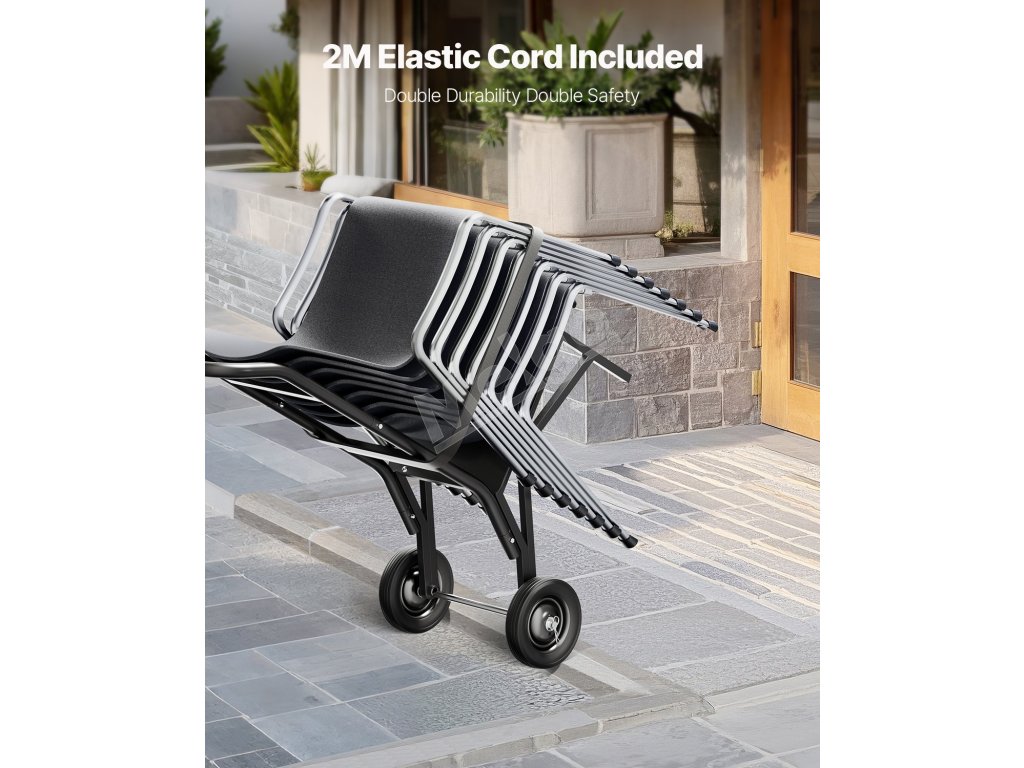 Tento vozík na jedálenské stoličky bez problémov kombinuje pohodlnú prepravu s priestorovo úsporným dizajnom, vďaka čomu je ideálny na rôzne podujatia, konferencie a iné. Je ideálnym riešením pre rodiny a školy, ktoré chcú efektívne usporiadať a uskladniť jedálenské stoličky.