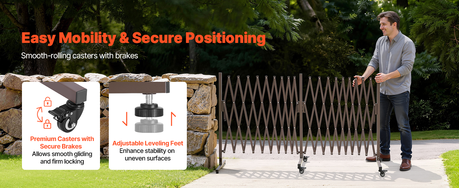 Táto bezpečnostná bariéra je vybavená štyrmi uzamykateľnými kolieskami, vďaka čomu sa ľahko presúva a umiestňuje na rôznych povrchoch, zatiaľ čo dve nastaviteľné vyrovnávacie nožičky zvyšujú stabilitu na nerovných povrchoch.