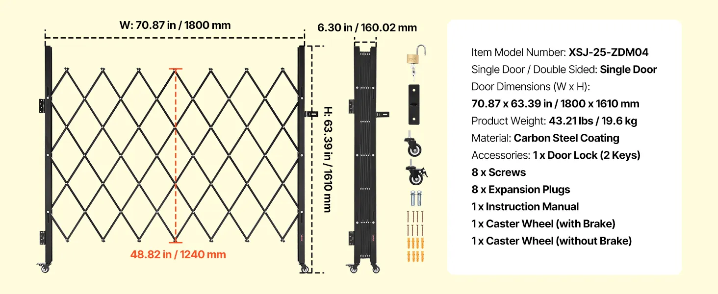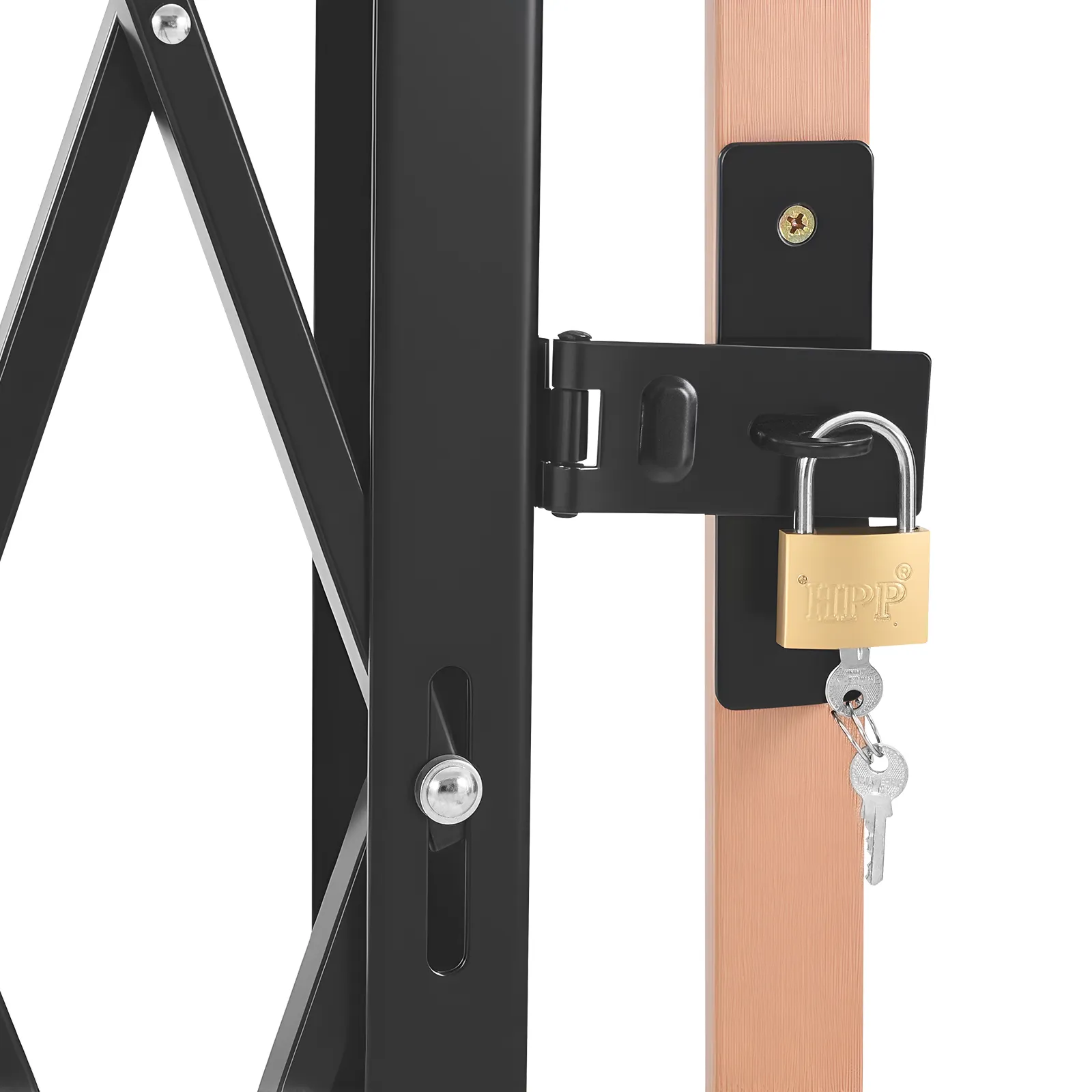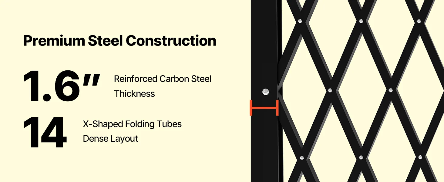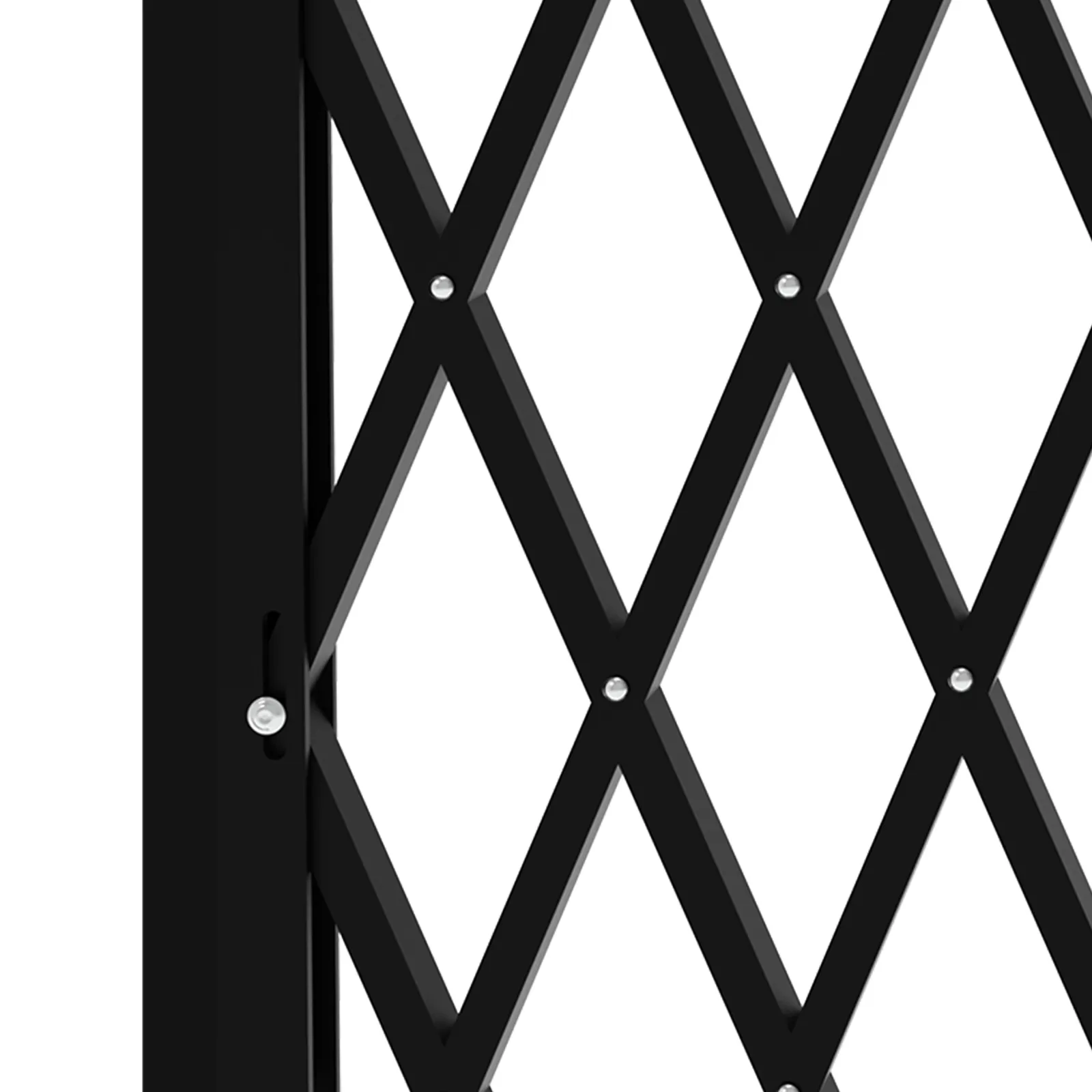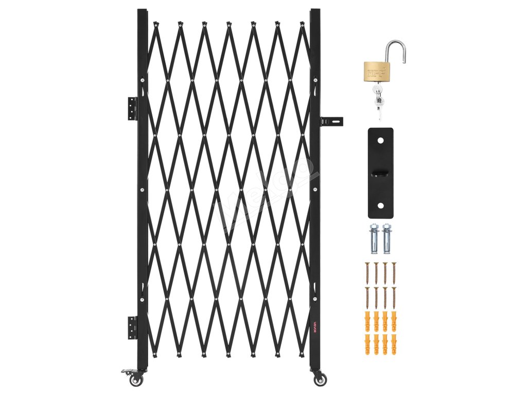 Naša skladacia bezpečnostná brána je vyrobená z odolného oceľového kanála s čiernym práškovým náterom na dlhšie používanie. Je vybavená zámkom na zvýšenie bezpečnosti a dodáva sa s inštalačnou súpravou, takže je ideálna na rušné chodby alebo vchody v komerčných priestoroch.