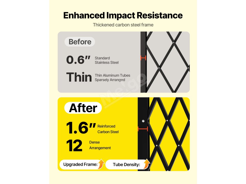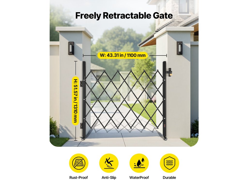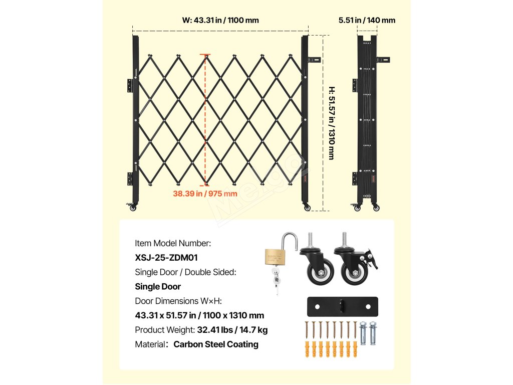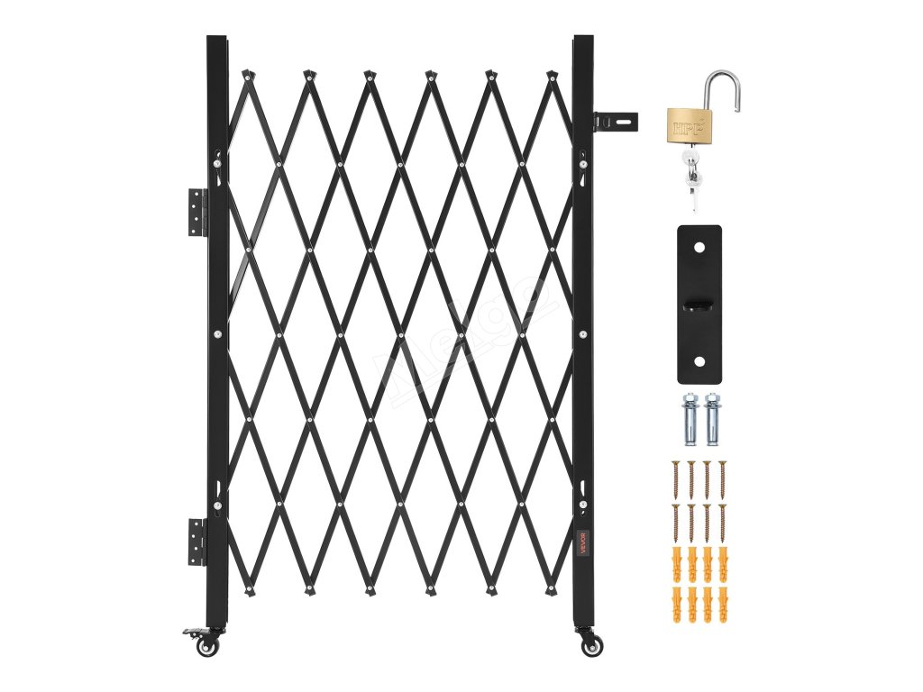 Naša skladacia bezpečnostná brána je vyrobená z odolného oceľového kanála s čiernym práškovým náterom na dlhšie používanie. Je vybavená zámkom na zvýšenie bezpečnosti a dodáva sa s inštalačnou súpravou, takže je ideálna na rušné chodby alebo vchody v komerčných priestoroch.