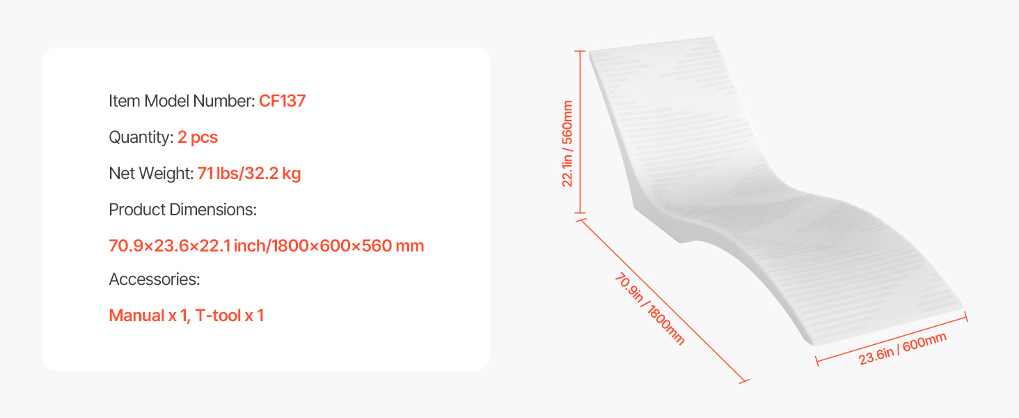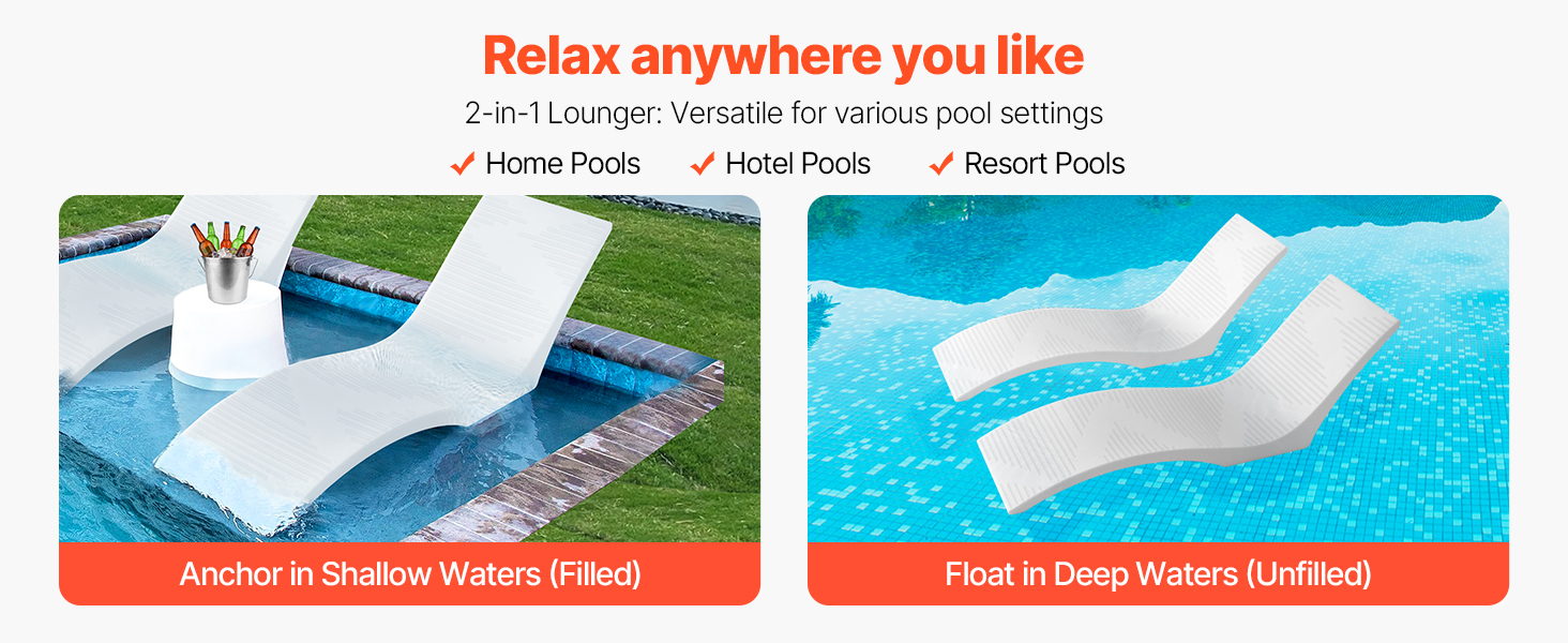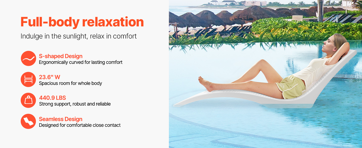 Lehátko do bazéna má ergonomický dizajn v tvare písmena S, ktorý sa prispôsobí chrbtici a zabezpečí dlhotrvajúce pohodlie. So šírkou sedadla 22,8" a nosnosťou 440,9 lbs/200 kg poskytuje dostatok priestoru a lepší zážitok z vody pre všetkých používateľov.