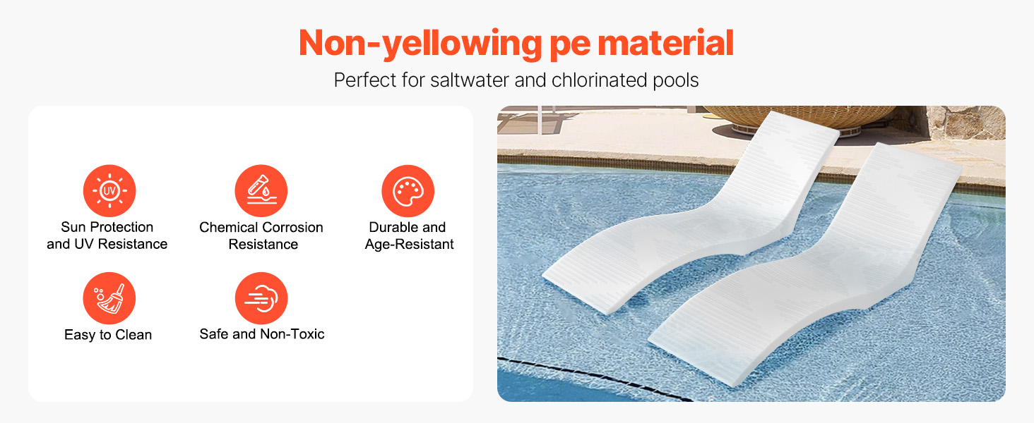 Toto bazénové lehátko vyrobené z odolného PE materiálu je navrhnuté tak, aby odolalo slnečnému žiareniu bez zožltnutia alebo starnutia. Je ideálne do bazénov so slanou vodou a chlórovanou vodou a zvyšky opaľovacieho krému sa dajú ľahko zotrieť.